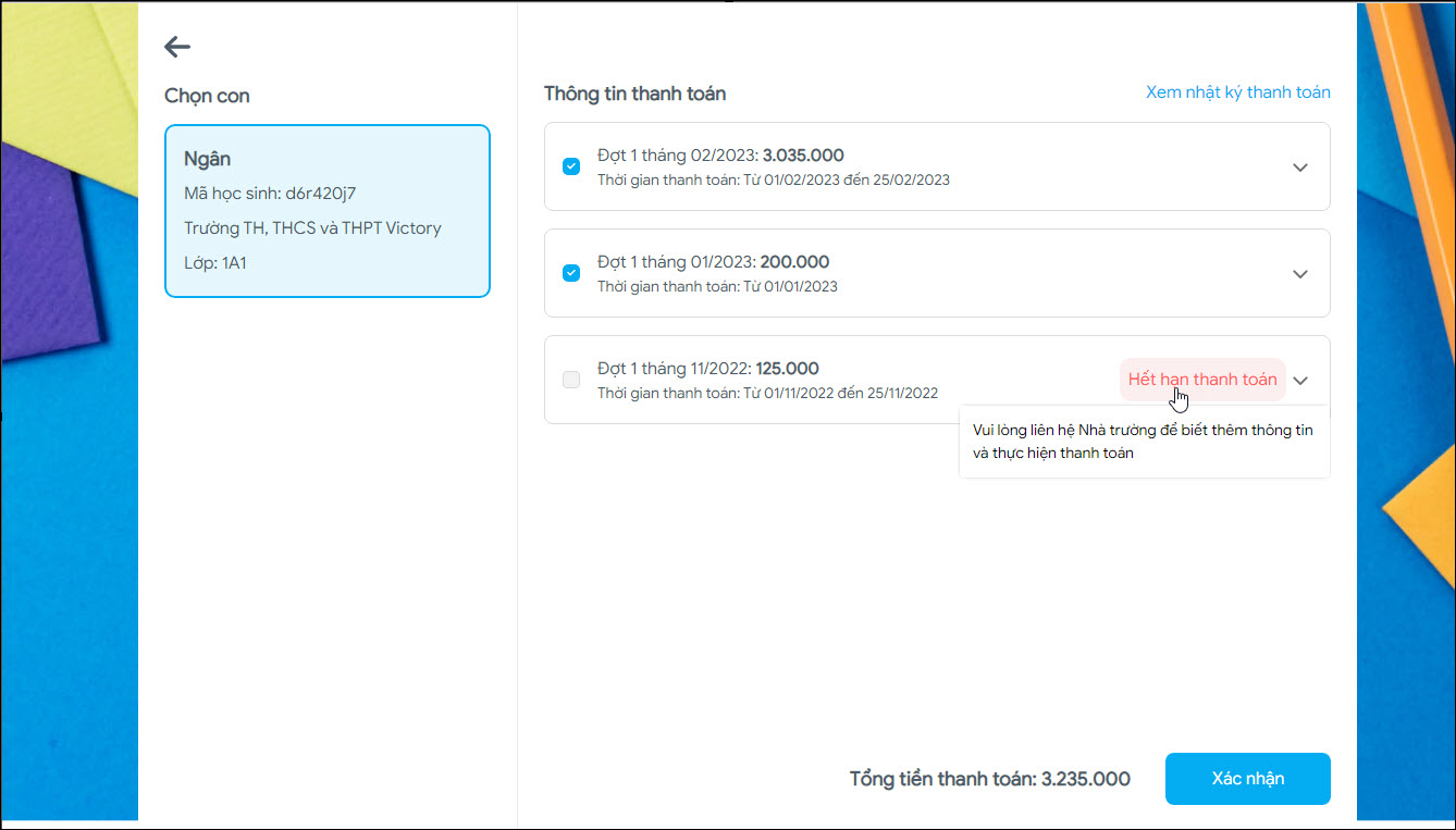 - Hiện tại trên cổng thanh toán, phụ huynh có thể theo dõi thông tin tiền học chi tiết từng đợt, từng khoản, gọi chung các đợt thu là Học phí đơt…, hết hạn Học phí và không theo dõi được ghi chú từ nhà trường.