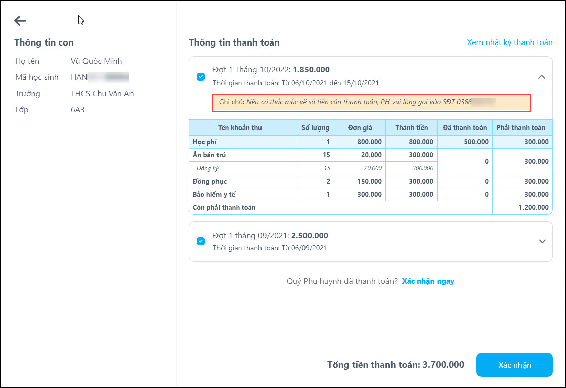 - Chọn Xác nhận: Lưu thay đổi, cập nhật thông tin thay đổi ở phía phụ huynh và gợi ý điều hướng đến màn Thông báo thu tiền.