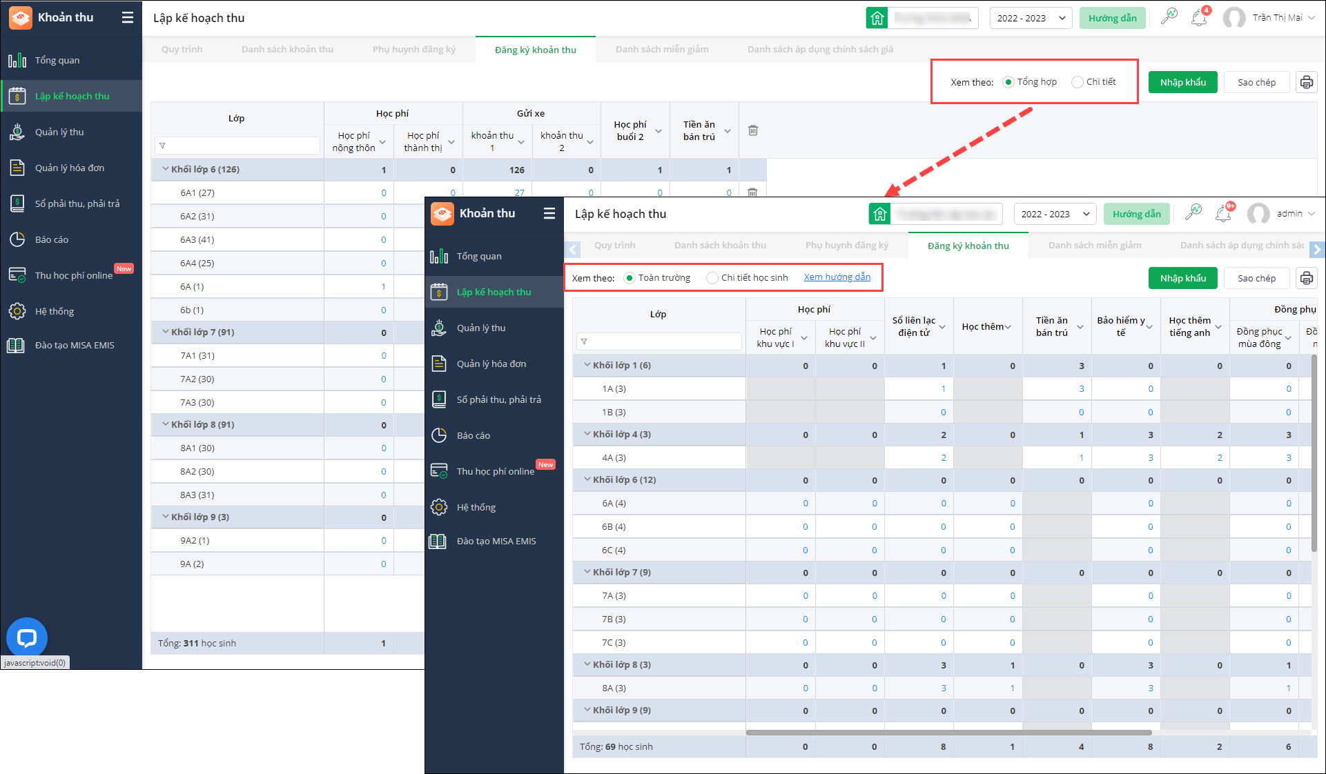 - Kế toán không biết chọn Xem theo Tổng hợp để đăng ký nhanh theo phạm vi (Toàn trường/Khối/Lớp) theo từng khoản thu.