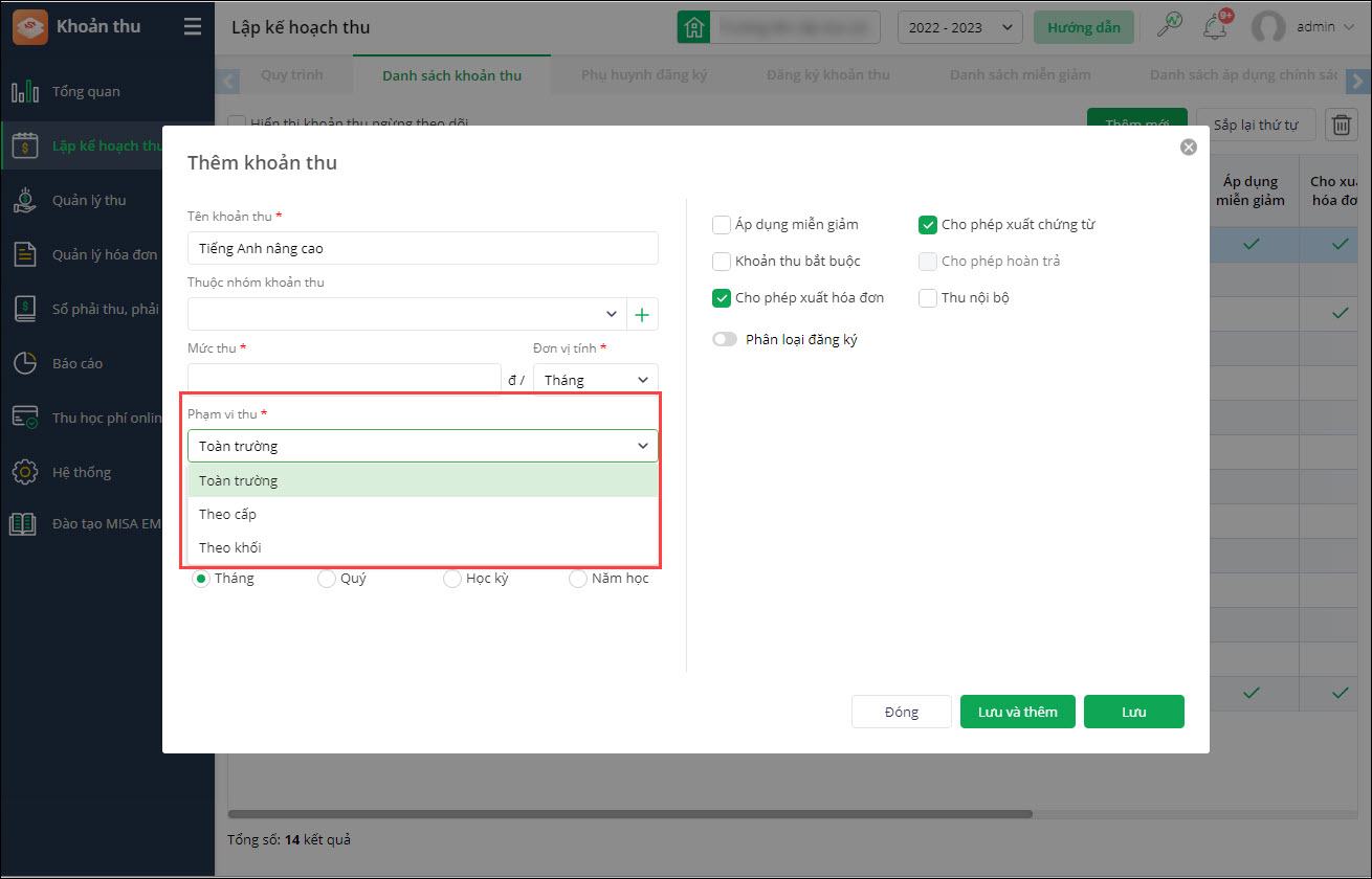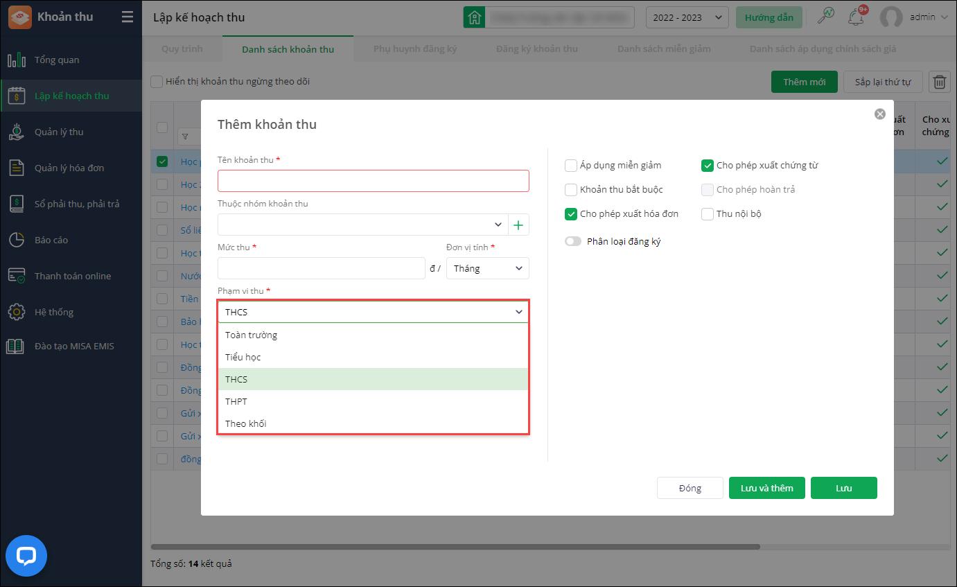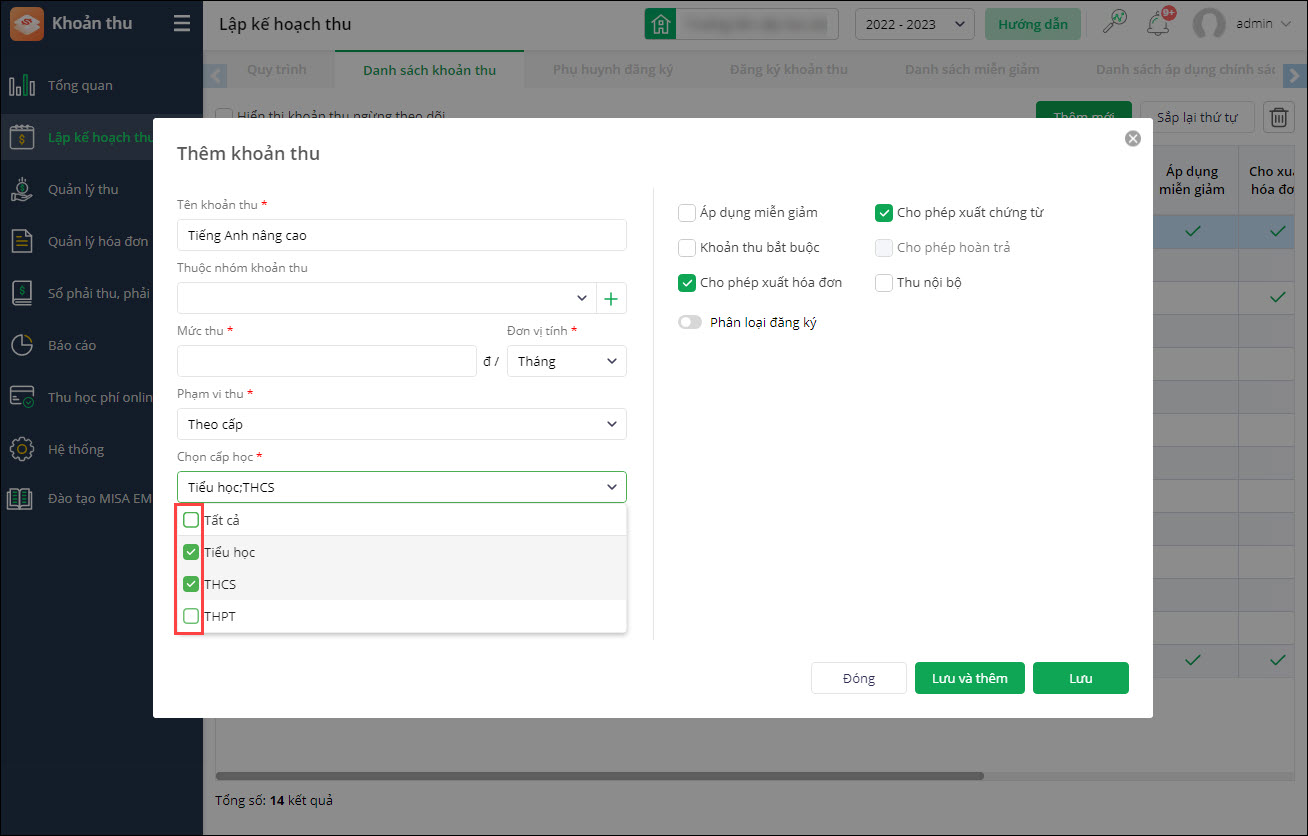 Với giai đoạn 1, tại các trường Liên cấp: Tại mục Lập kế hoạch thu\Danh sách khoản thu, khi Thêm khoản thu:
