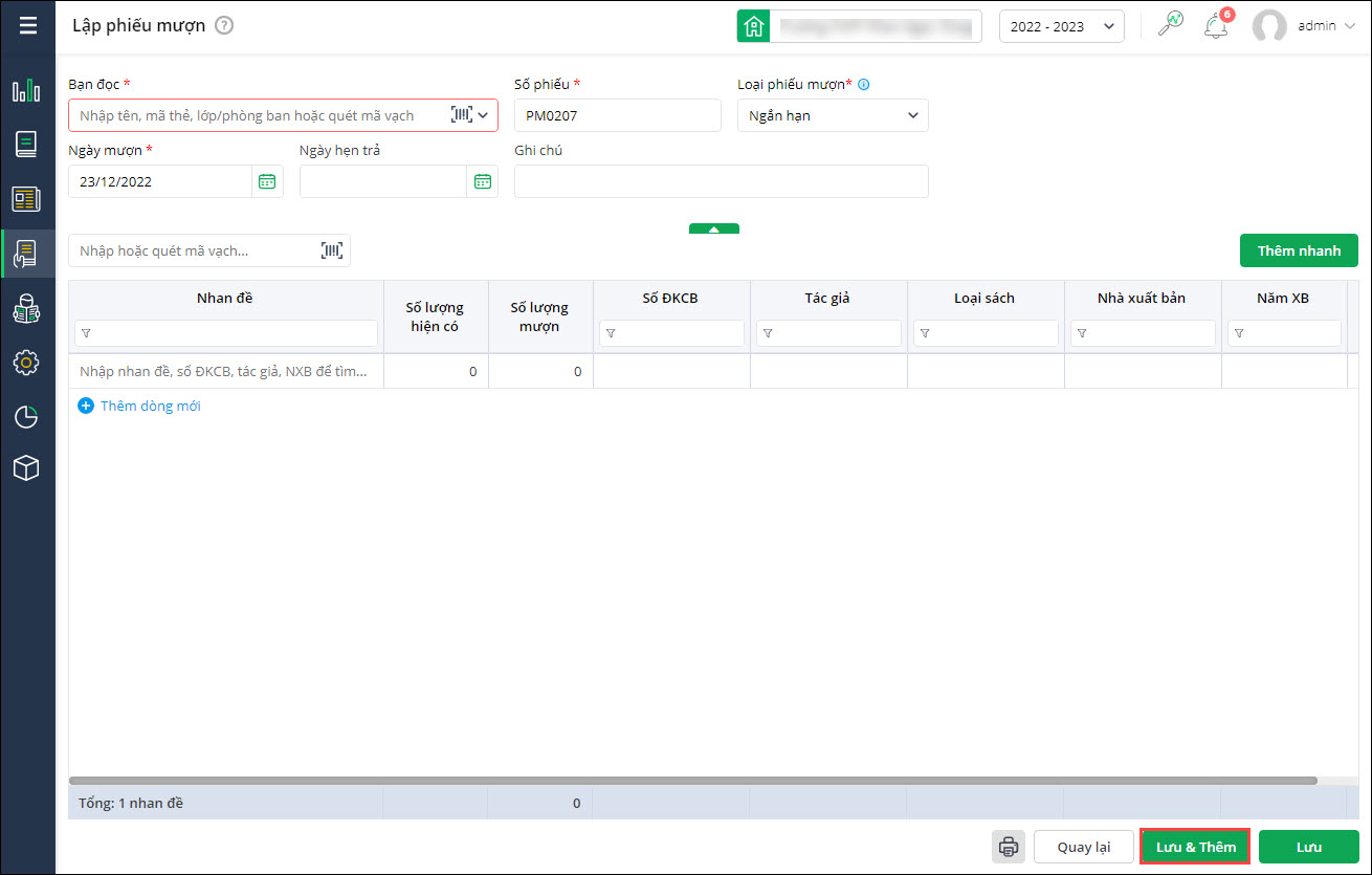 - Tại Mượn trả\Quản lý mượn trả: Khi Lập phiếu mượn mới, bổ sung button Lưu & Thêm.