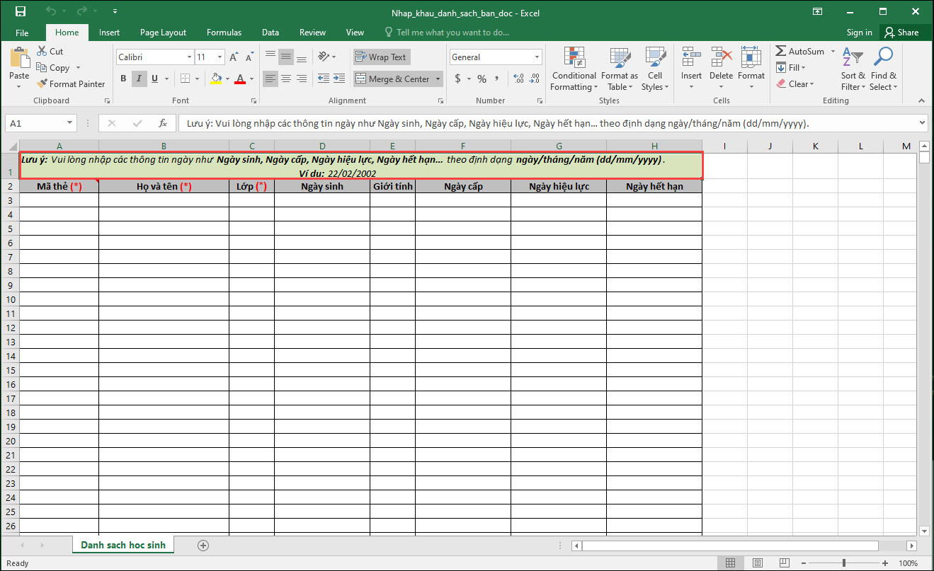 - Trên file nhập khẩu bổ sung dòng ghi chú định dạng ngày tháng để CBTV chủ động nhập đúng trước khi nhập khẩu.