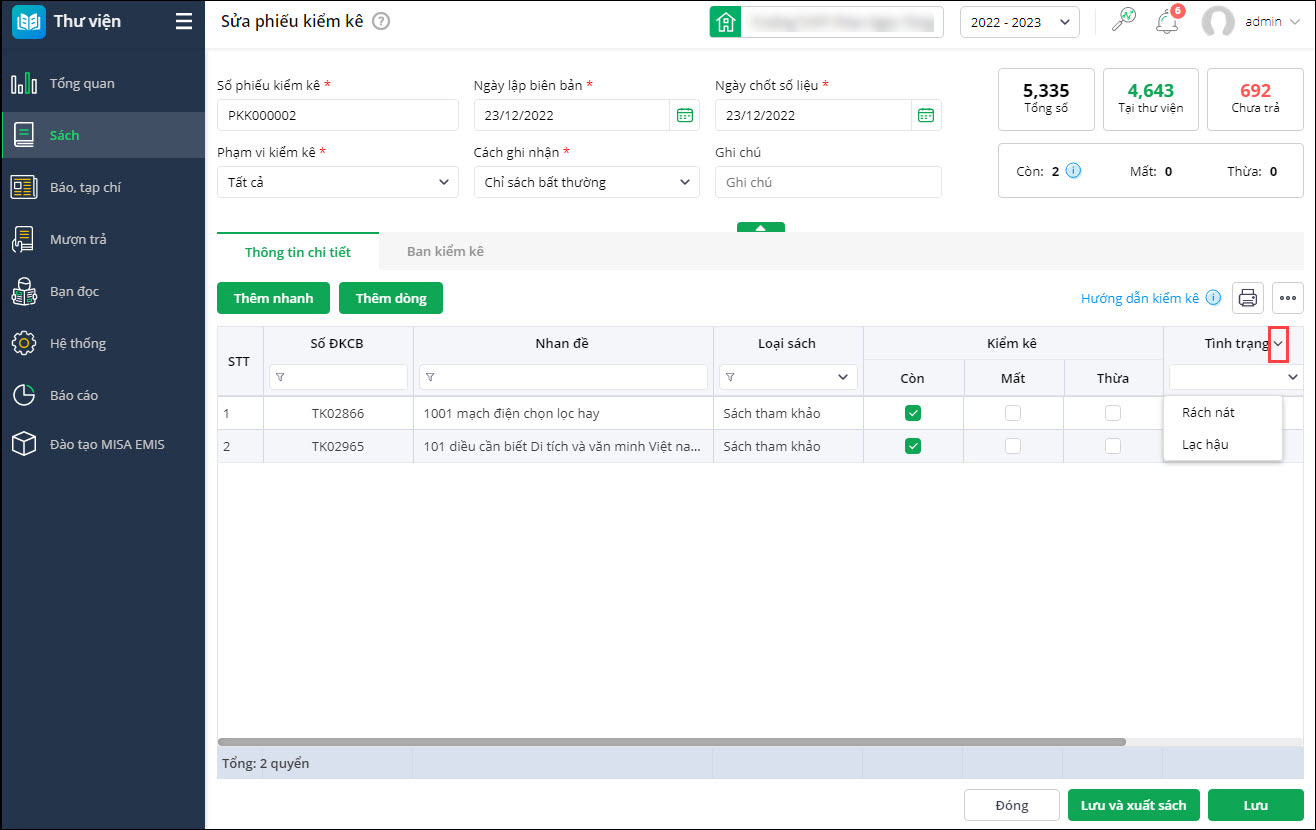 - Sau khi chọn, tự động nhập giá trị Tình trạng cho tất cả sách trong danh sách có loại Kiểm kê là Còn hoặc Thừa.