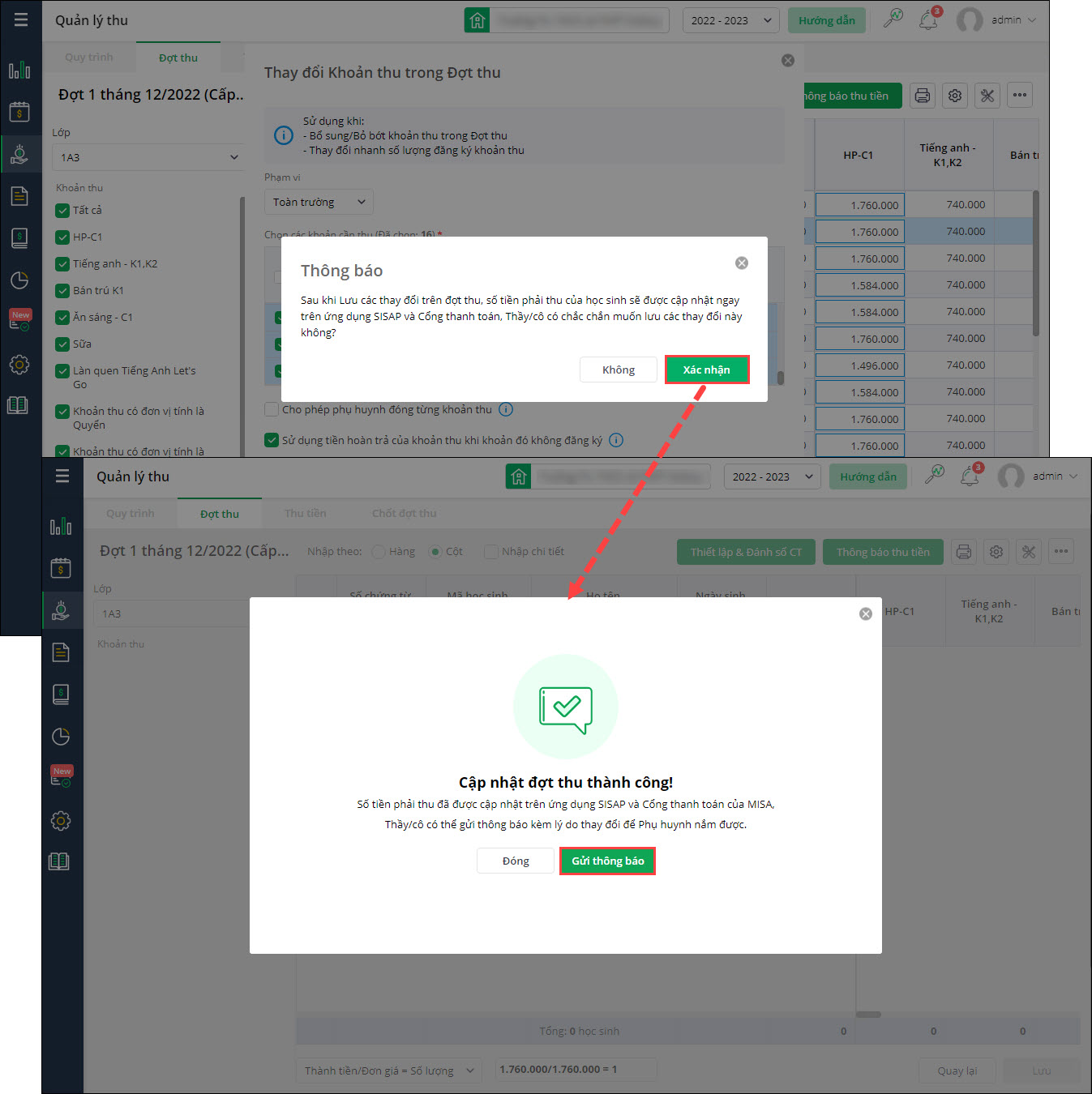 - Đối với các đợt thu đã gửi thông báo thu tiền: Khi kế toán thực hiện thao tác gây ảnh hưởng đến số tiền phải thu của học sinh (Chỉnh sửa trên đợt thu; Cập nhật đợt thu;…) sẽ hiển thị thông báo xác nhận.