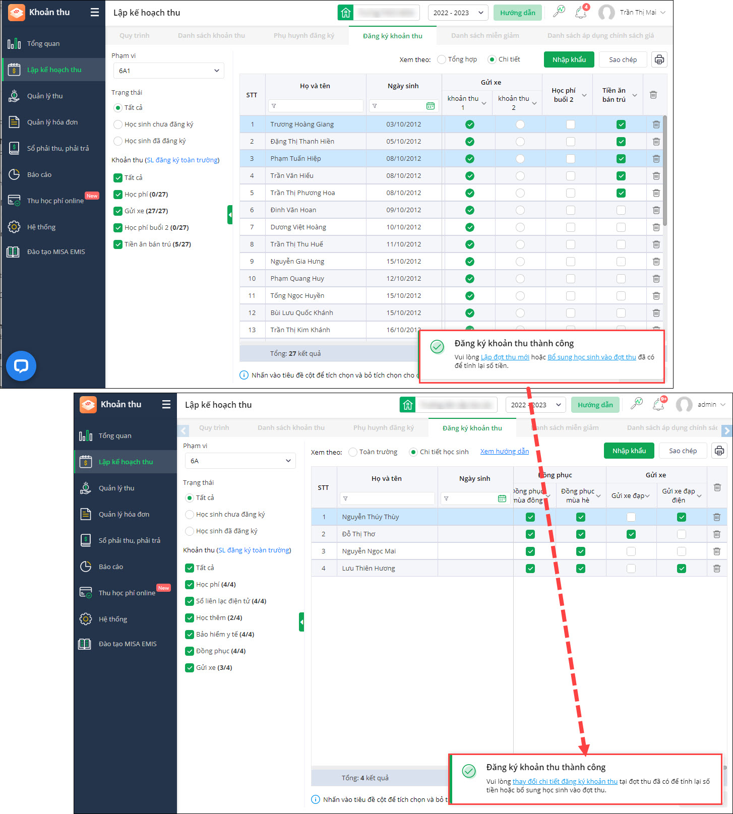 - Kế toán sau khi thay đổi trạng thái đăng ký khoản thu có thể nhanh chóng cập nhật vào đợt thu đã lập để tính toán lại số tiền phải thu của học sinh.