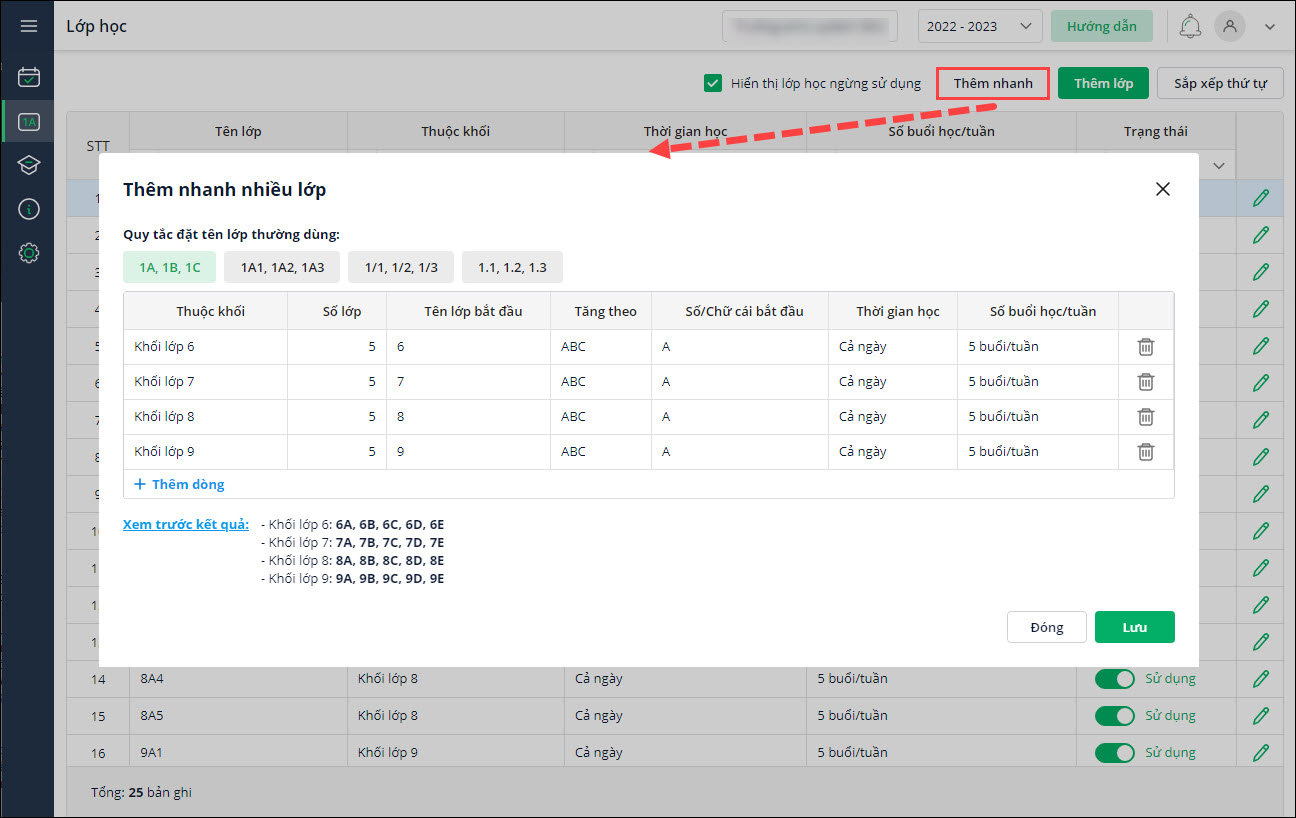 - Nếu chọn Thêm nhanh: Phần mềm có gợi ý sẵn những quy tắc đặt tên lớp thường dùng, anh/chị có thể chọn luôn hoặc thiết lập quy tắc của riêng đơn vị: