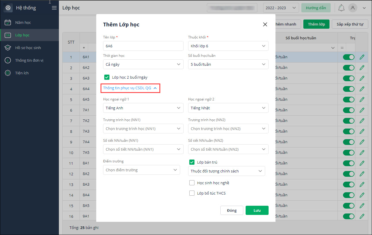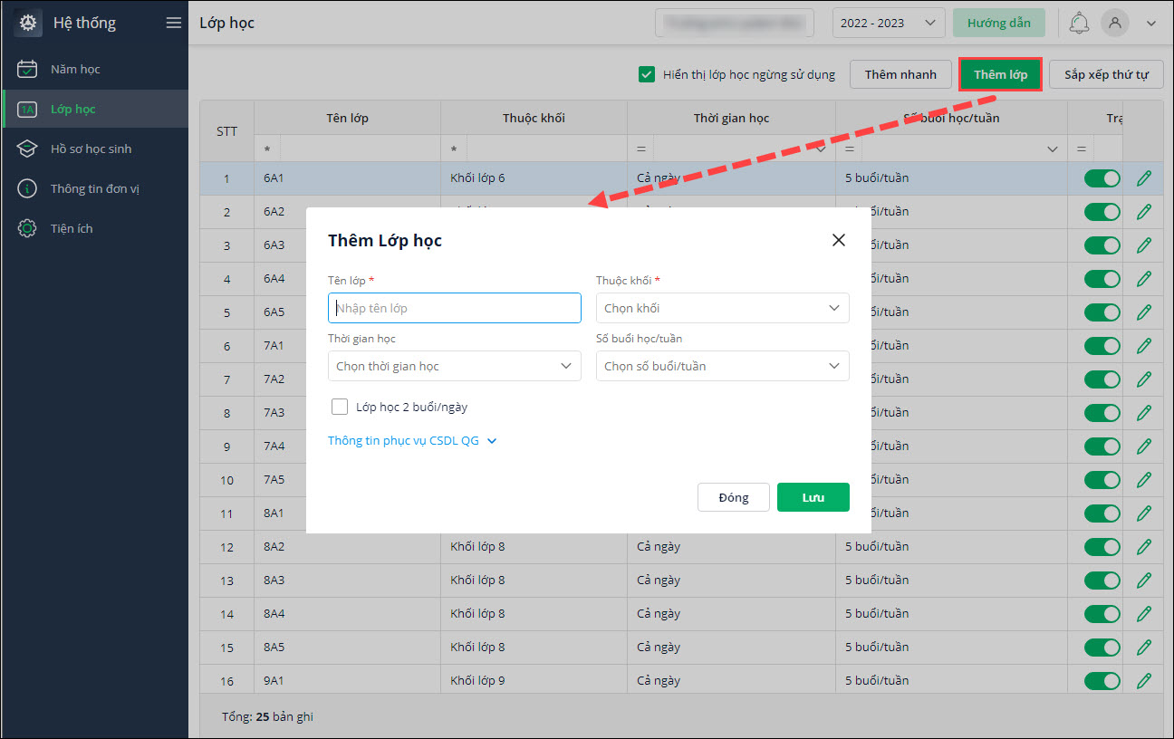 - Khai báo lần lượt thông tin lớp vào ô tương ứng (Tên lớp; Thuộc khối; Thời gian học; Số buổi/tuần; Lớp học 2 buổi/ngày)