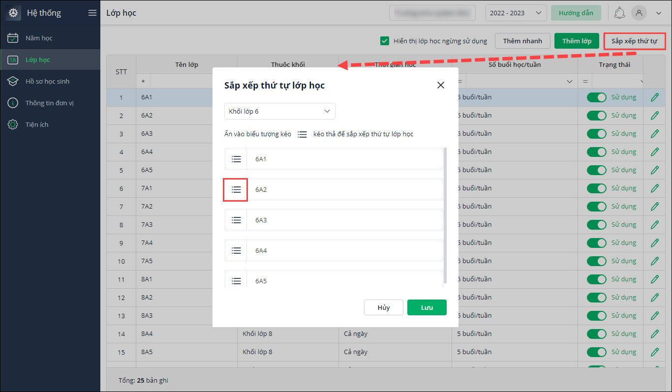 3. Để thay đổi thứ tự các lớp trong báo cáo đầu ra, anh/chị có thể Sắp xếp thứ tự lớp học bằng cách nhấn vào biểu tượng bên dưới và kéo thả lớp đến vị trí mong muốn trong danh sách. Nhấn Lưu để cập nhật thứ tự.