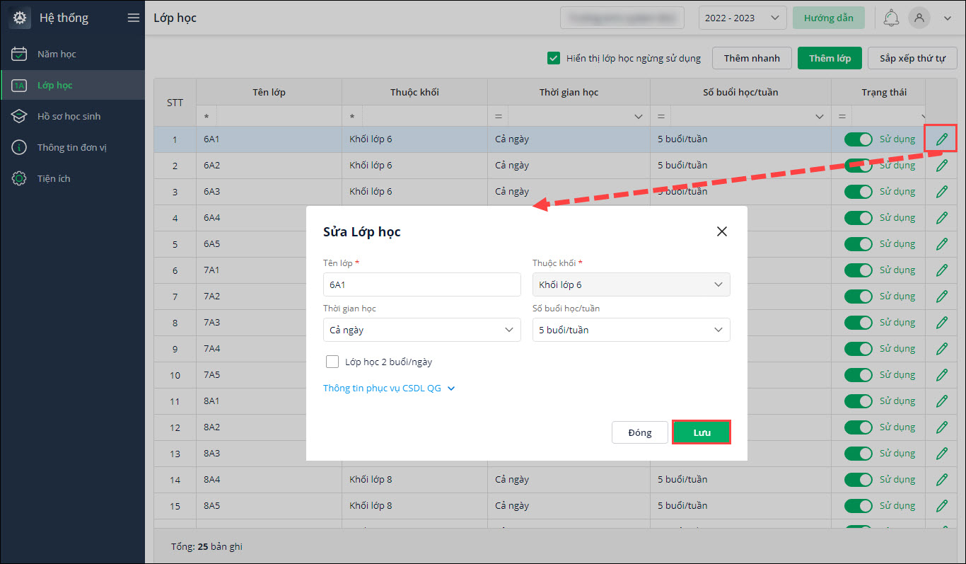 4. Trường hợp lớp có thay đổi thông tin, anh/chị nhấn đúp vào dòng thông tin lớp hoặc nhấn vào biểu tượng cây bút cuối dòng để chỉnh sửa lớp. Nhấn Lưu để cập nhật thông tin thay đổi.