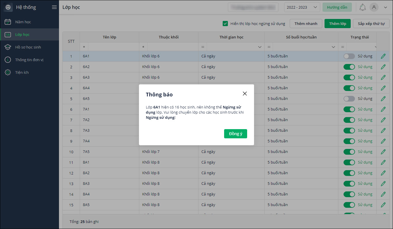 Lưu ý: Anh/chị cần chuyển học sinh trong lớp sang lớp khác trước khi thao tác Ngừng sử dụng lớp.