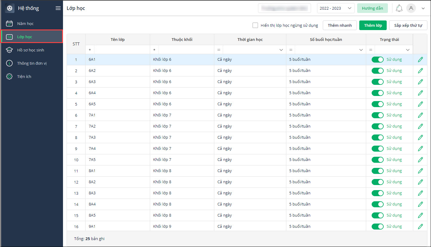 - Vào Hệ thống\Lớp học. Tại đây phần mềm thống kê danh sách lớp học tại nhà trường mà anh/chị đã khai báo ban đầu.