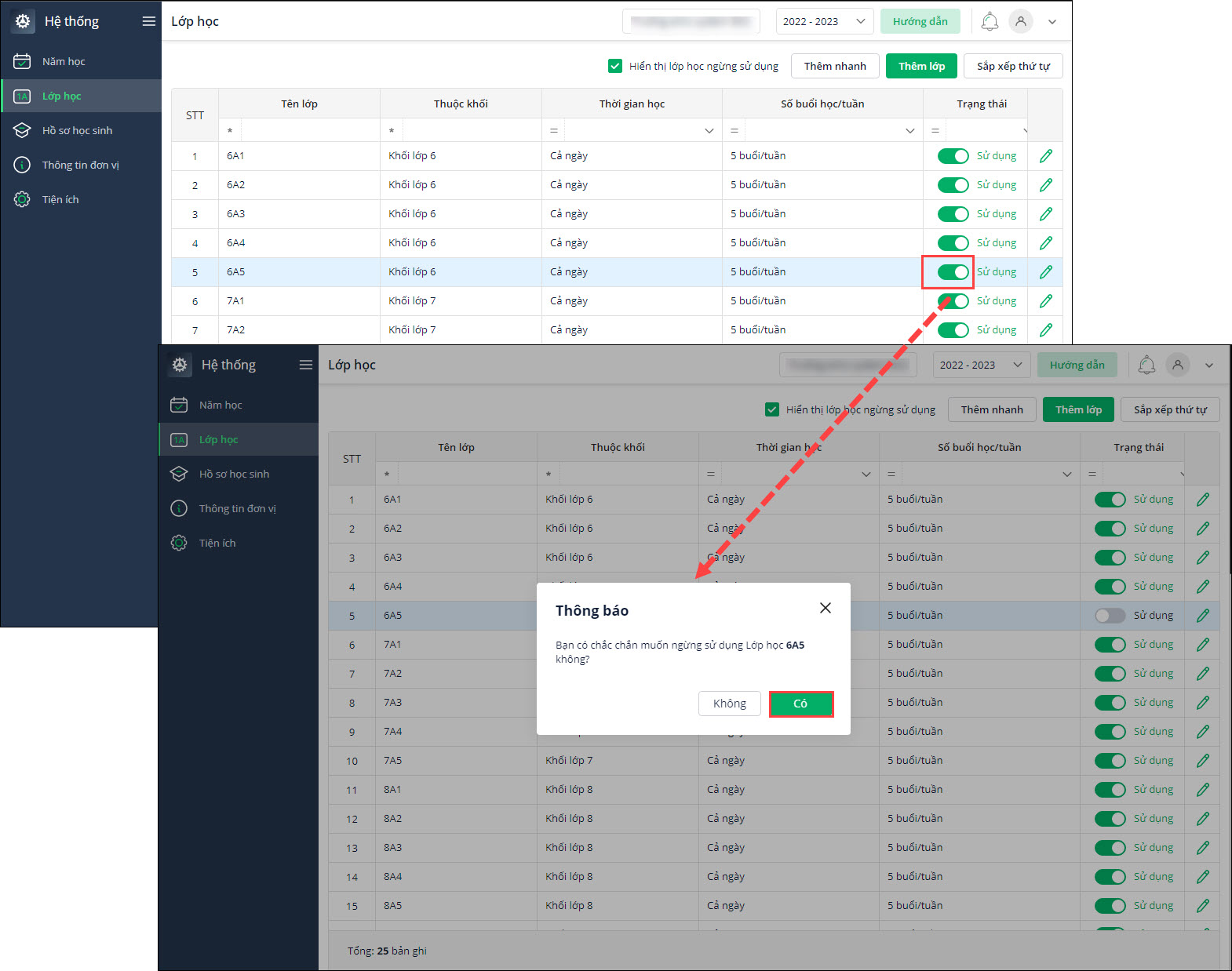 5. Nếu nhà trường bỏ bớt lớp trong năm học này, anh/chị có thể chuyển trạng thái lớp về Ngừng sử dụng.