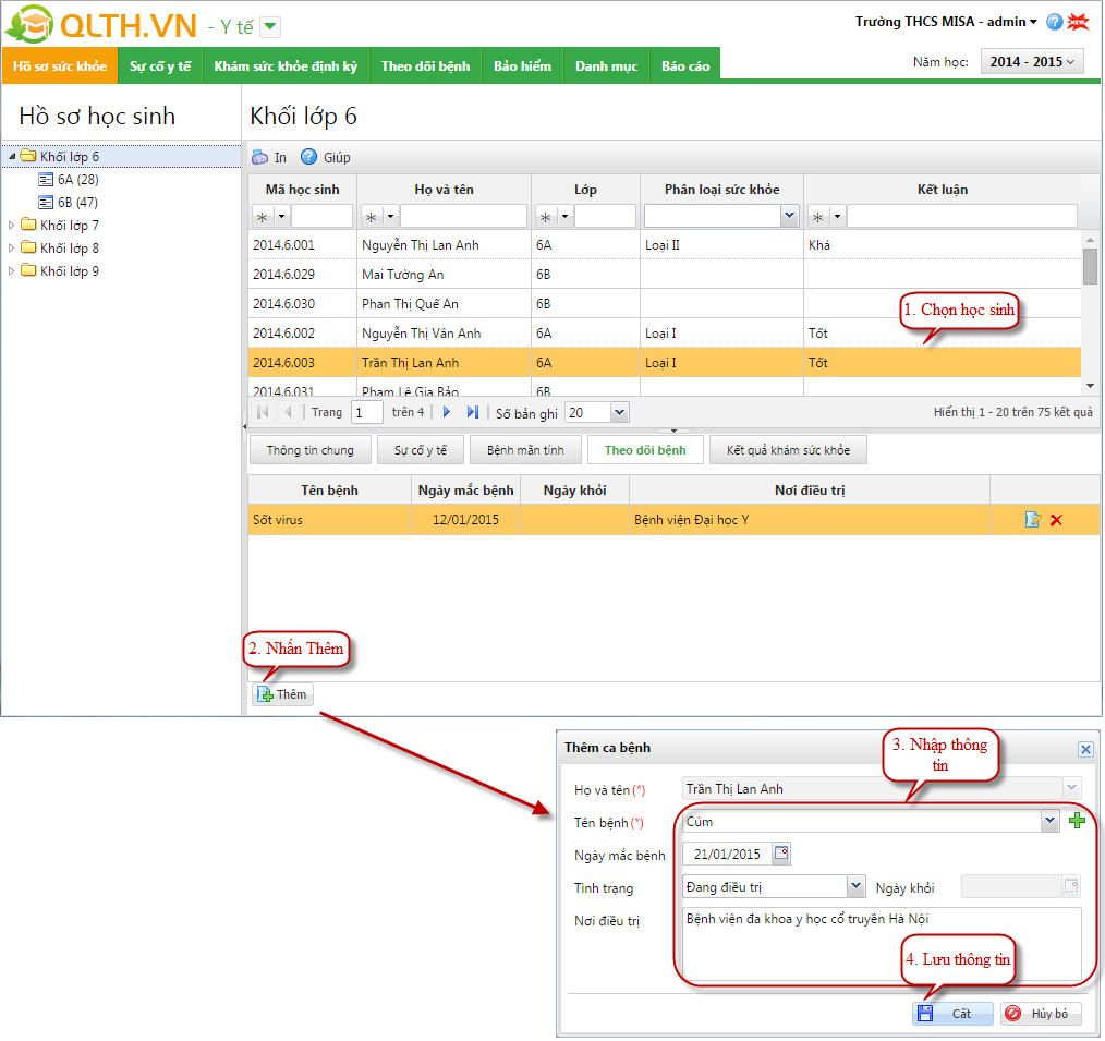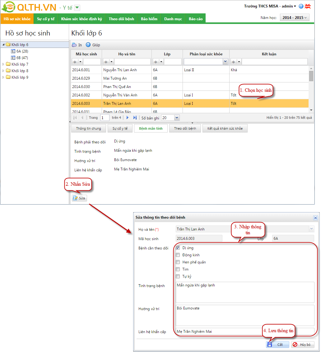 Cán bộ y tế muốn cập nhật các thông tin sức khỏe của từng học sinh trên phần mềm