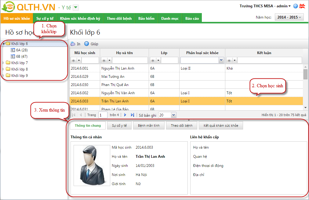 Phần mềm QLTH.VN hỗ trợ cán bộ y tế quản lý các thông tin hồ sơ sức khỏe của học sinh như: Thông tin chung, Danh sách các sự cố mà học sinh đã từng gặp, Danh sách các bệnh mãn tính của học sinh cần theo dõi, Danh sách các lần mắc bệnh của từng học sinh & Kết quả của học sinh trong từng đợt khám sức khỏe.