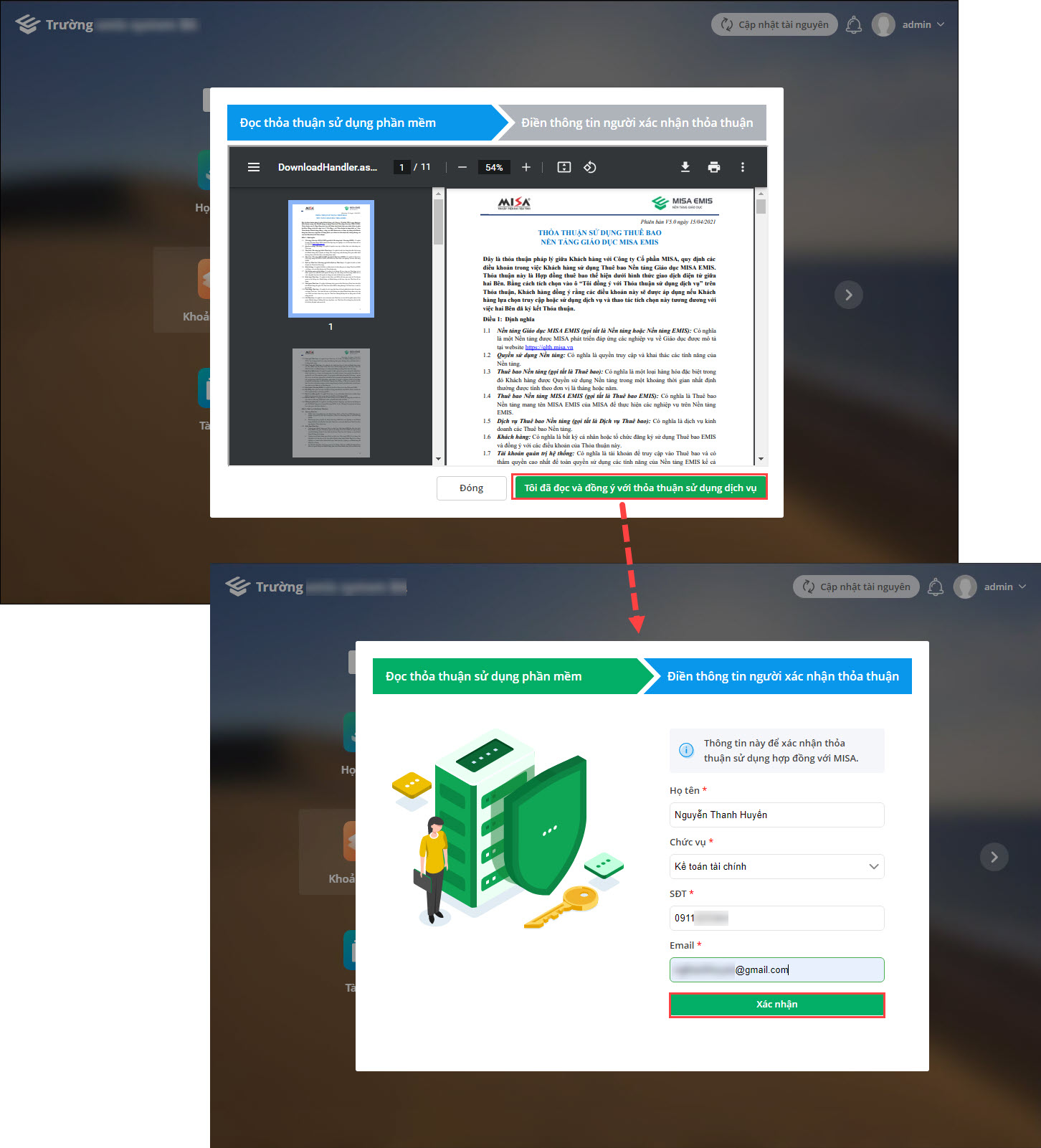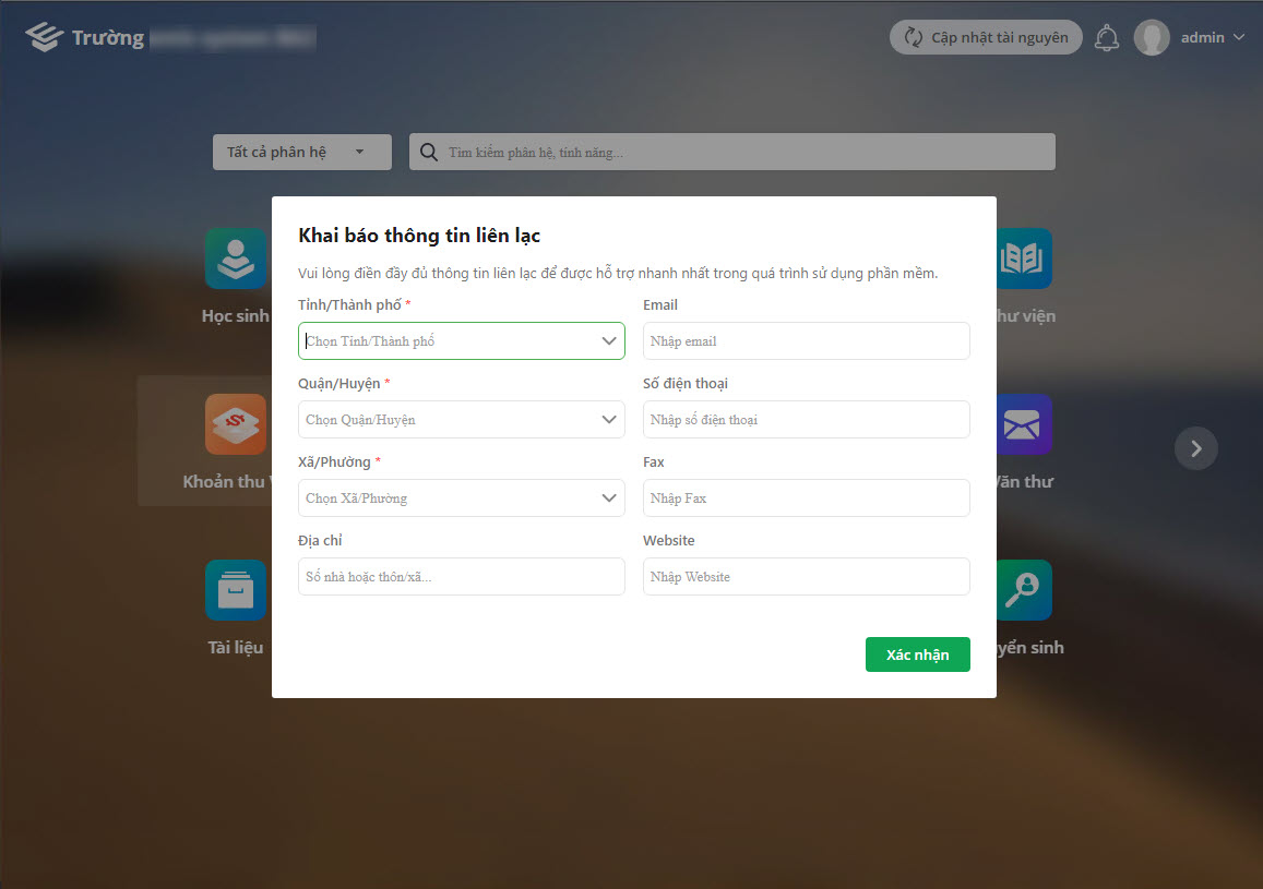 - Sau khi đăng ký thỏa thuận sử dụng thành công, nhập thông tin liên lạc của nhà trường để được hỗ trợ nhanh chóng trong quá trình sử dụng phần mềm.
