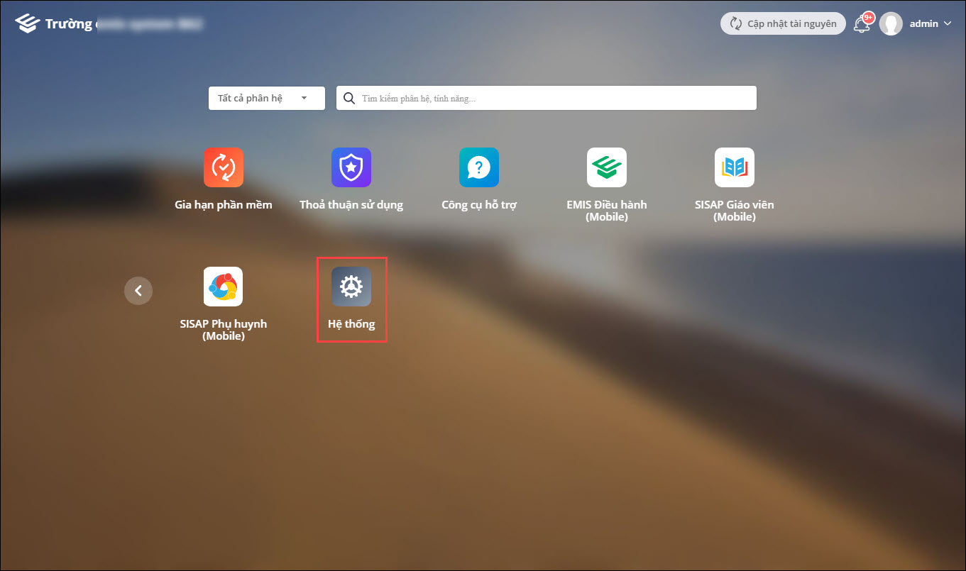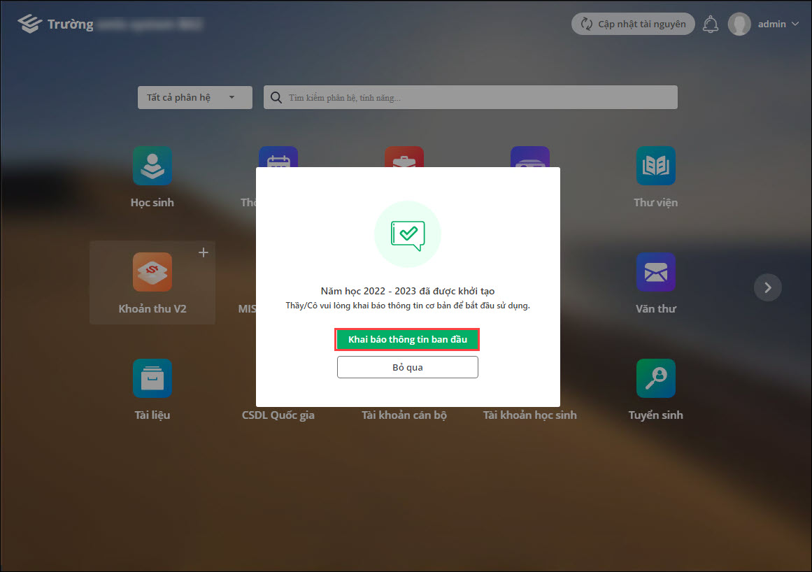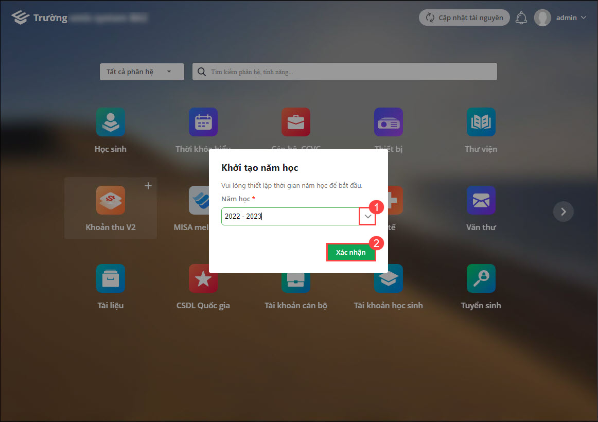 - Nhấn chọn vào phân hệ để khởi tạo năm học.