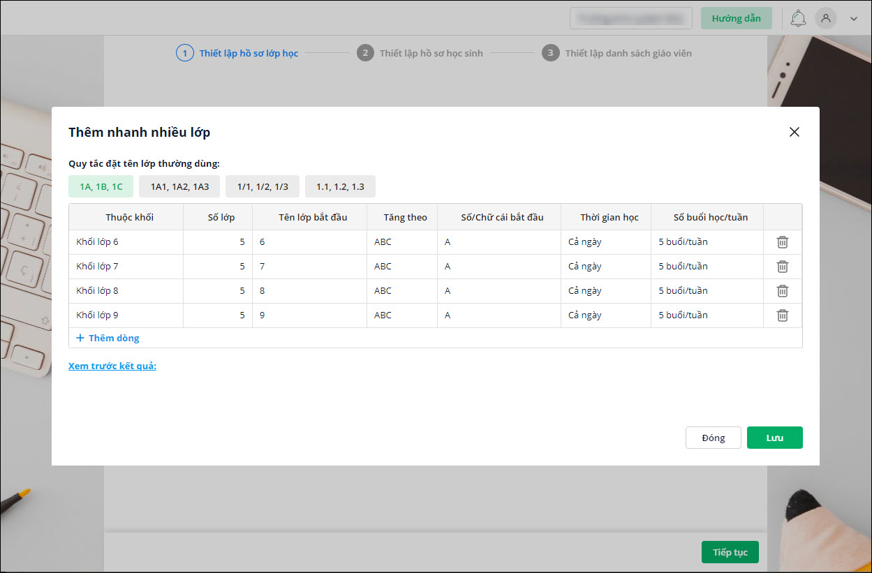 - Nếu chọn Thêm nhanh danh sách lớp: Phần mềm có gợi ý sẵn những quy tắc đặt tên lớp thường dùng, anh/chị có thể chọn luôn hoặc thiết lập quy tắc của riêng đơn vị:
