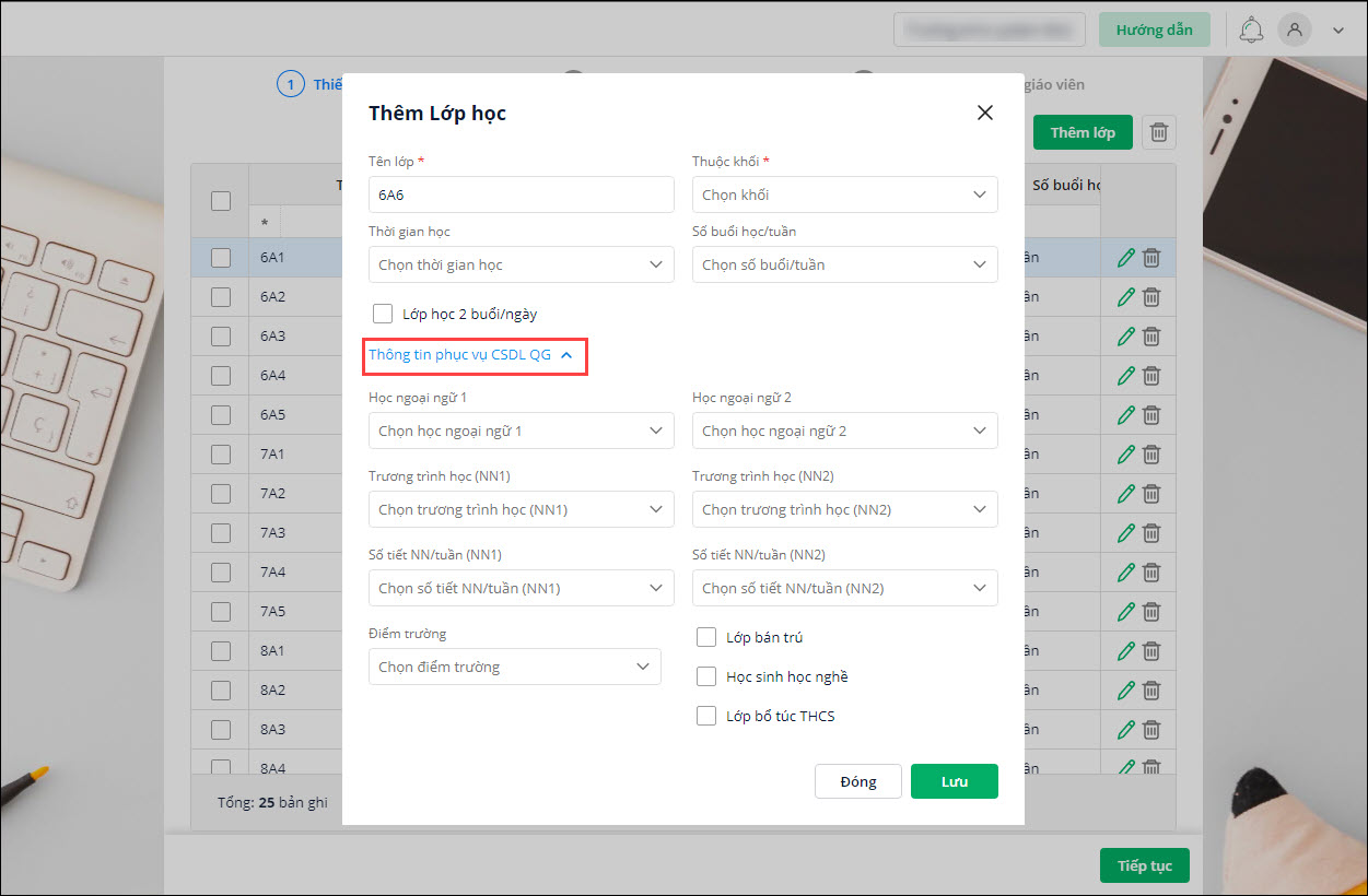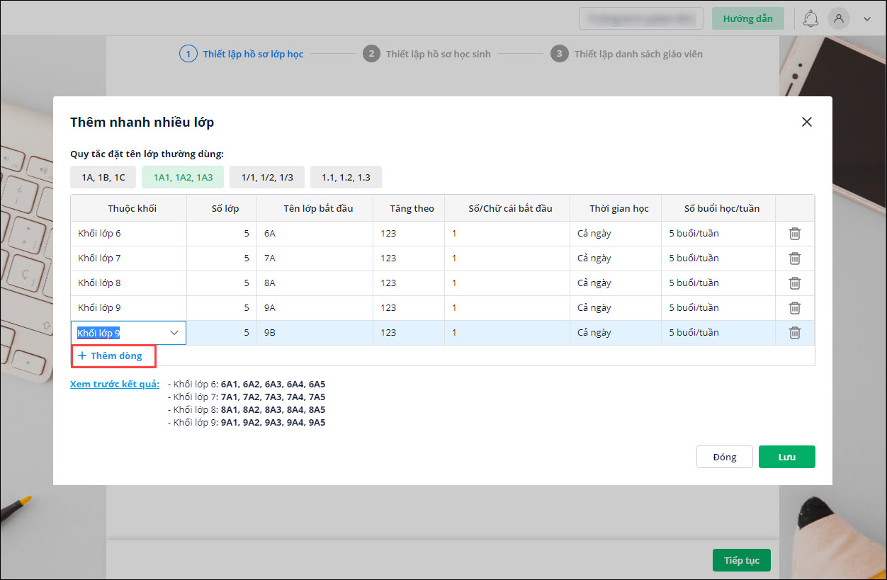 - Lưu ý: Trường hợp trong cùng 1 khối trường chia ban từ 9A1 -> 9A6 và 9B1 -> 9B5; anh/chị chọn Thêm dòng trong cùng Nhóm lớp.
