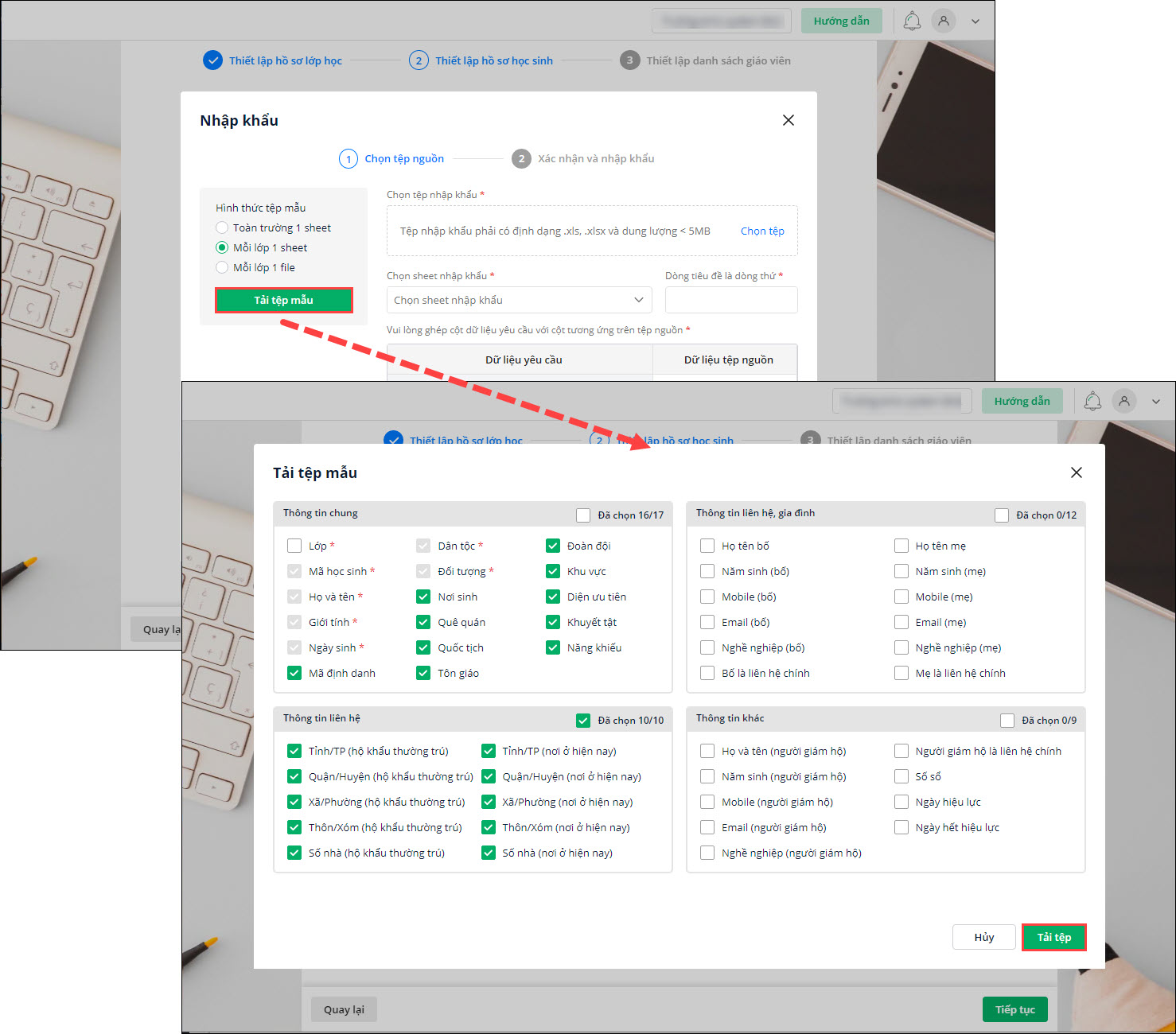 - Chọn Hình thức tệp mẫu (Toàn trường 1 sheet; Mỗi lớp 1 sheet; Mỗi lớp 1 file excel) và các thông tin học sinh muốn nhập khẩu vào phần mềm. Nhấn Tải tệp.