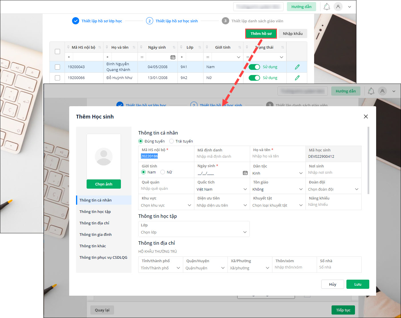 - Ngoài ra, anh/chị có thể khai báo bổ sung từng học sinh bằng cách chọn Thêm hồ sơ, Khai báo thông tin học sinh vào ô tương ứng, nhấn Lưu.