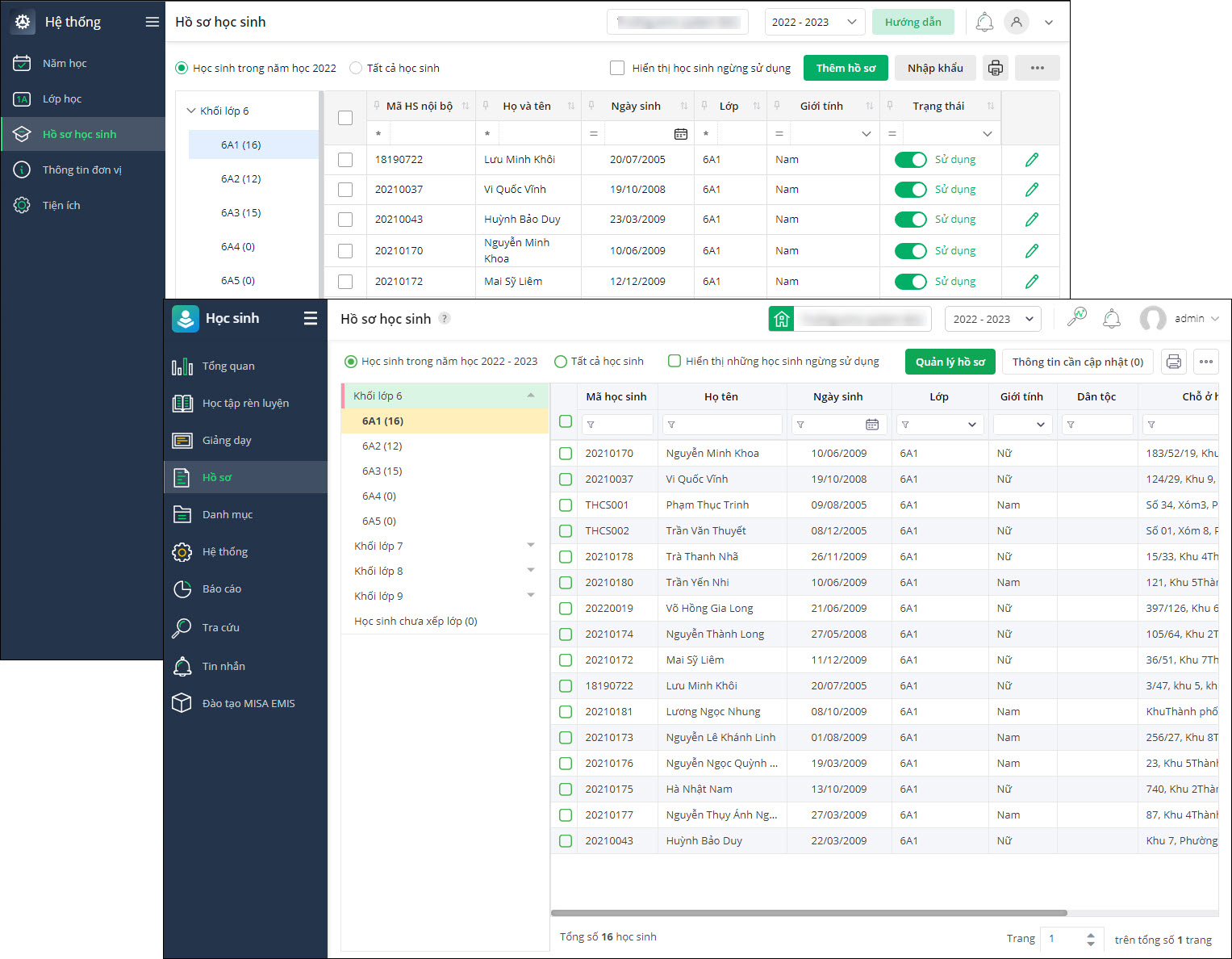 - Khi truy cập vào phân hệ mới để bắt đầu sử dụng, như ví dụ là nhà trường sử dụng thêm phân hệ EMIS Học sinh. Phần mềm tự động cập nhật sẵn thông Danh sách lớp học; Danh sách học sinh; Danh sách giáo viên mà anh/chị đã khai báo tại Hệ thống.