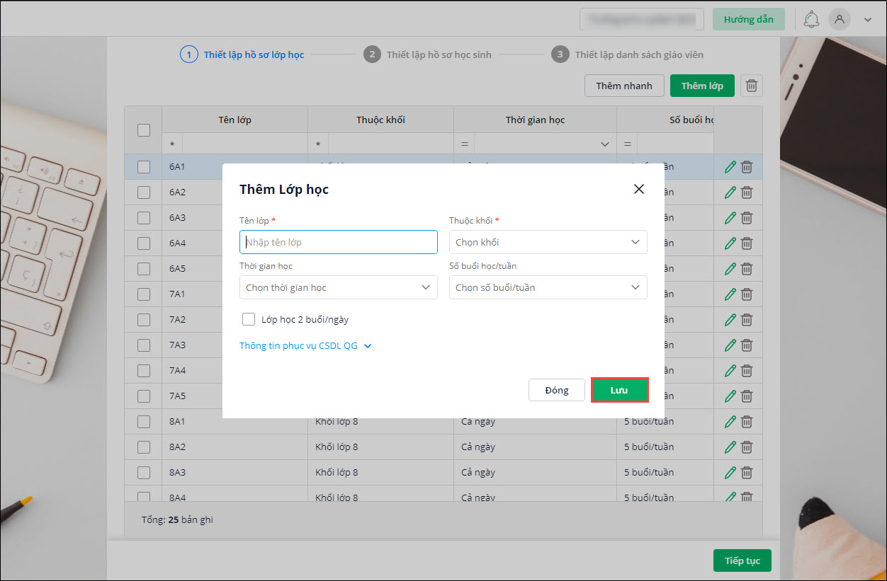 - Nhấn Lưu để lưu thông tin lớp học tại đơn vị.