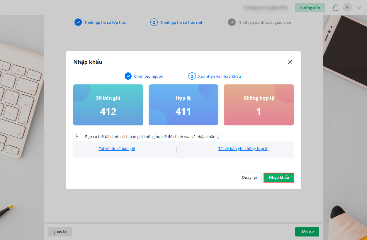 - Với bản ghi Hợp lệ: Anh/chị chọn Nhập khẩu để nhập khẩu thông tin vào phần mềm.
