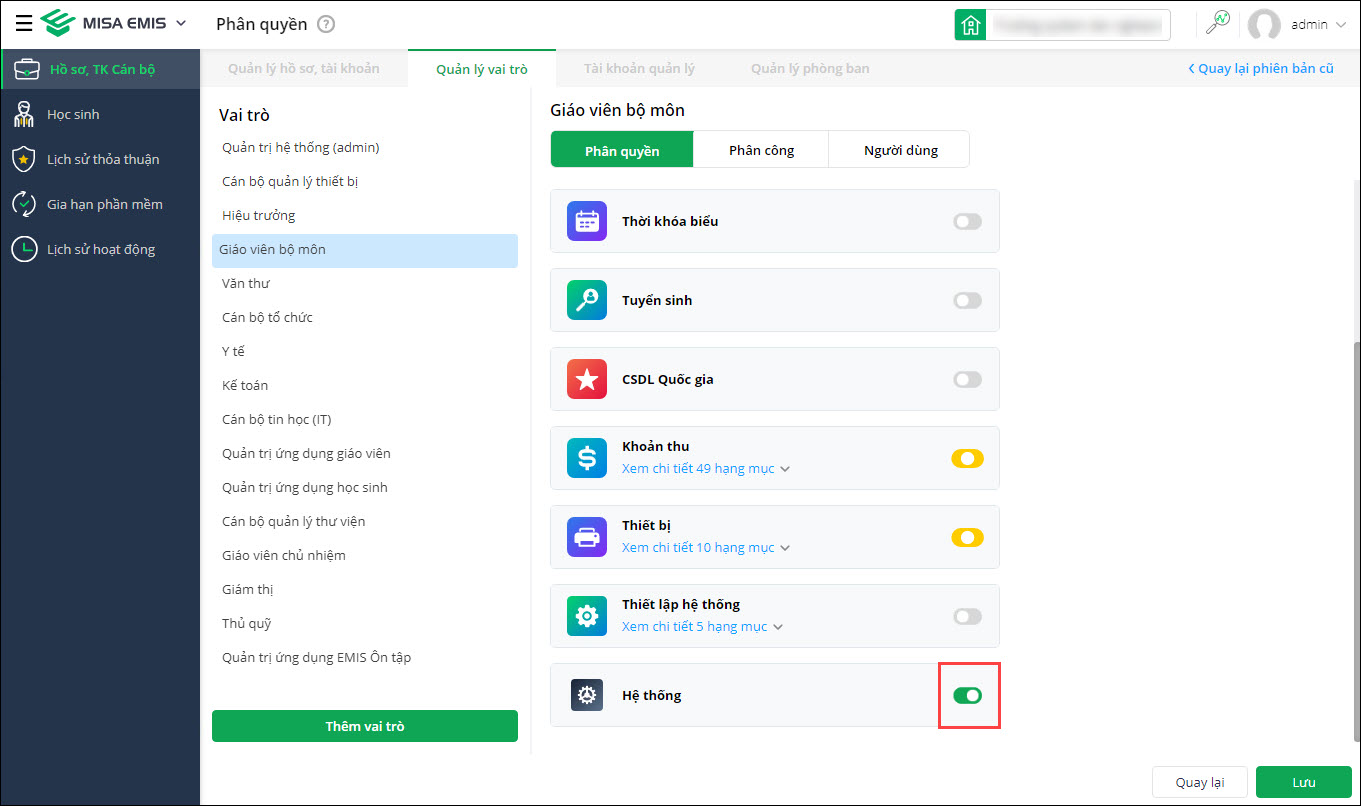- Phần mềm tự động điều hướng sang phân hệ Tài khoản cán bộ, anh/chị làm theo hướng dẫn chi tiết tại đây để khai báo thông tin giáo viên, phân quyền tài khoản,….