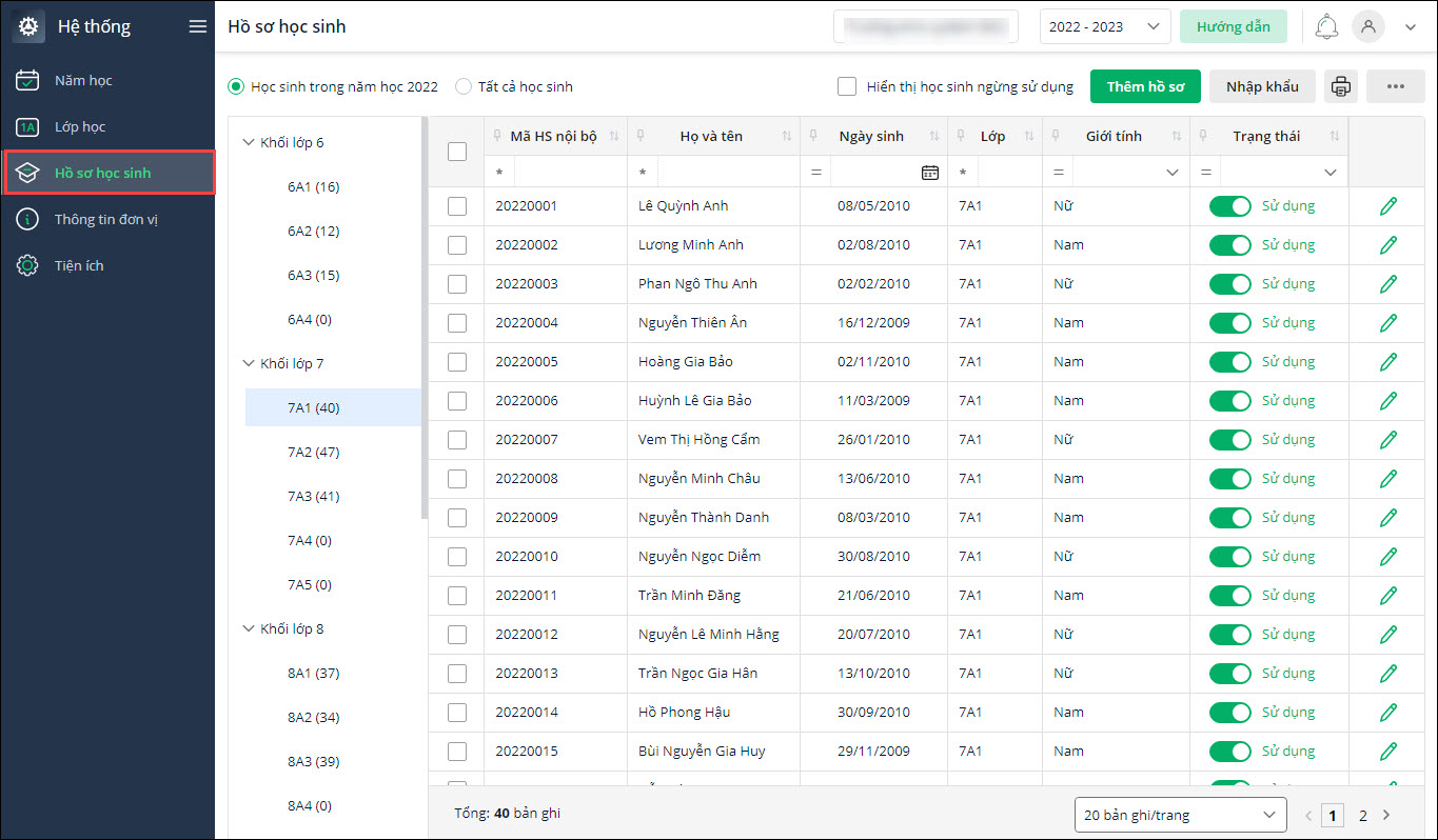 - Vào Hệ thống\Hồ sơ học sinh, tại đây phần mềm lấy lên danh sách học sinh tại đơn vị anh/chị đã khai báo ban đầu khi bắt đầu sử dụng phần mềm. Mọi thay đổi thông tin về hồ sơ học sinh tại các phân hệ sẽ được ghi nhận và quản lý tập trung tại đây, thay vì quản lý riêng rẽ tại từng phân hệ như trước đây.