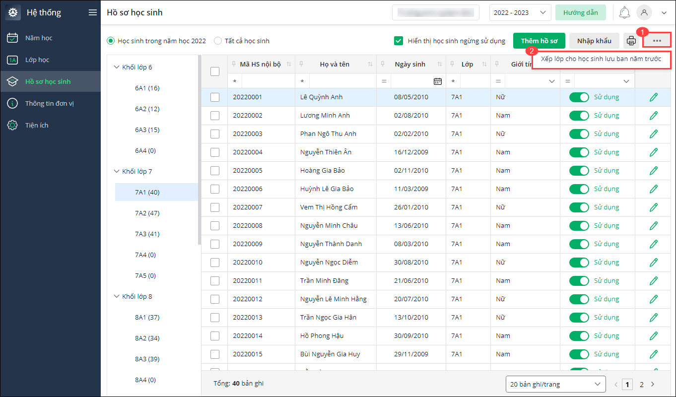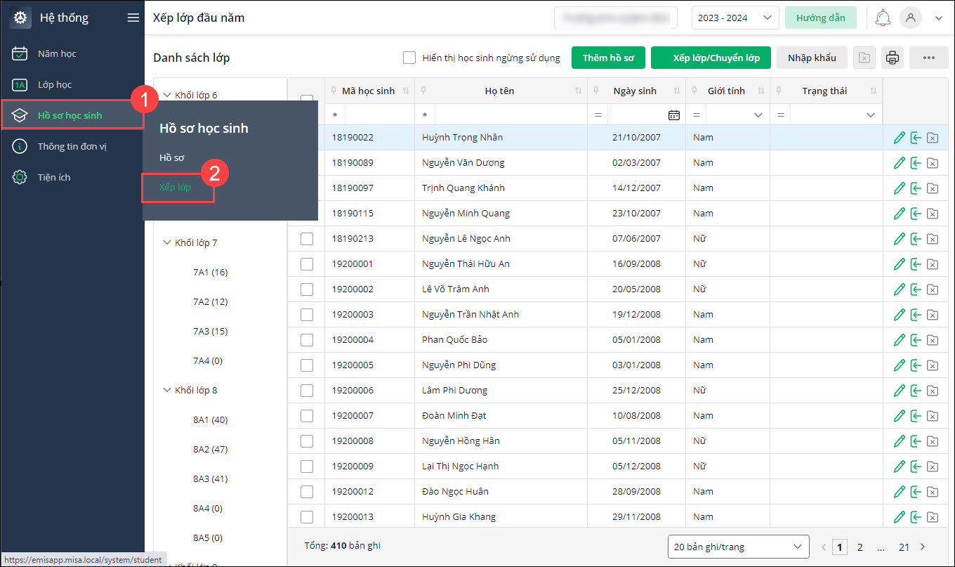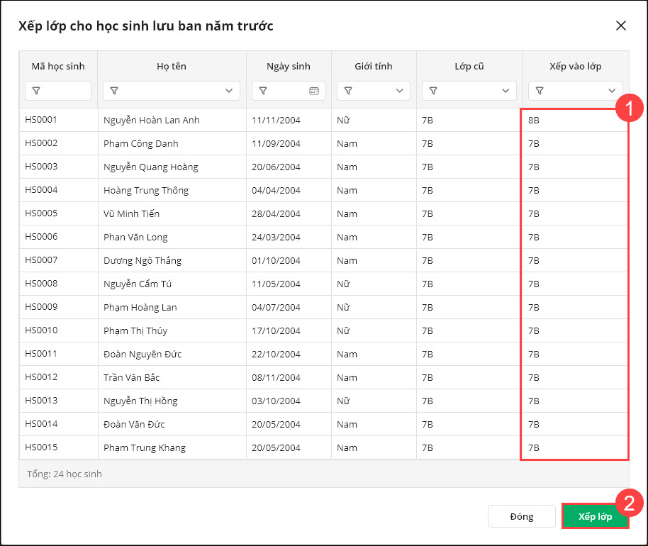 - Phần mềm hiển thị danh sách học sinh theo lớp hiện tại. Anh/chị thao tác như sau để xếp lớp cho học sinh: