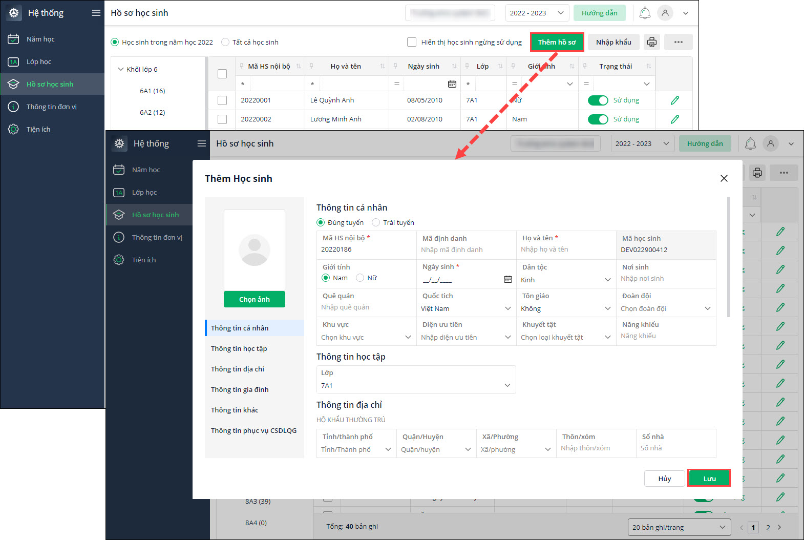 - Nếu chọn Thêm hồ sơ: Khai báo thông tin học sinh vào ô tương ứng, nhấn Lưu.