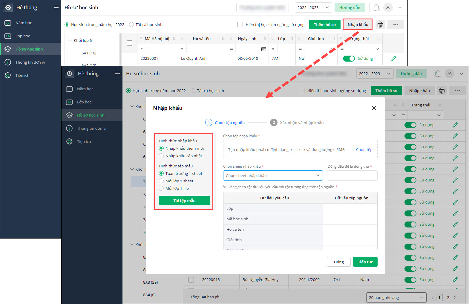 - Nếu chọn Nhập khẩu: Anh/chị chọn hình thức Nhập khẩu thêm mới (Để thêm mới hoàn toàn danh sách học sinh) hoặc Nhập khẩu cập nhật (Cập nhật thêm thông tin học sinh từ danh sách sẵn có)