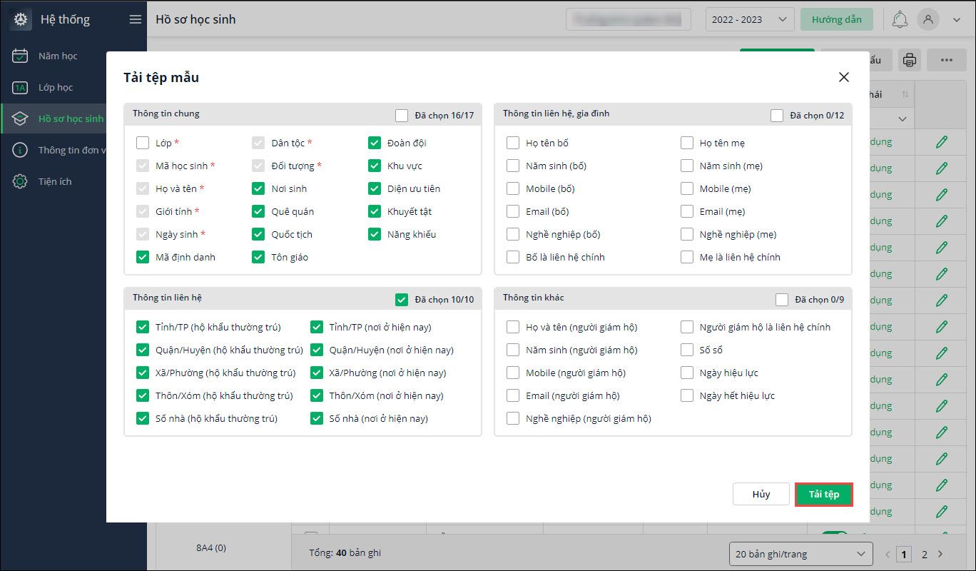 - Chọn Hình thức tệp mẫu (Toàn trường 1 sheet; Mỗi lớp 1 sheet; Mỗi lớp 1 file) và các thông tin học sinh muốn nhập khẩu vào phần mềm cho phù hợp với công tác nhập liệu tại đơn vị. Chọn Tải tệp mẫu.