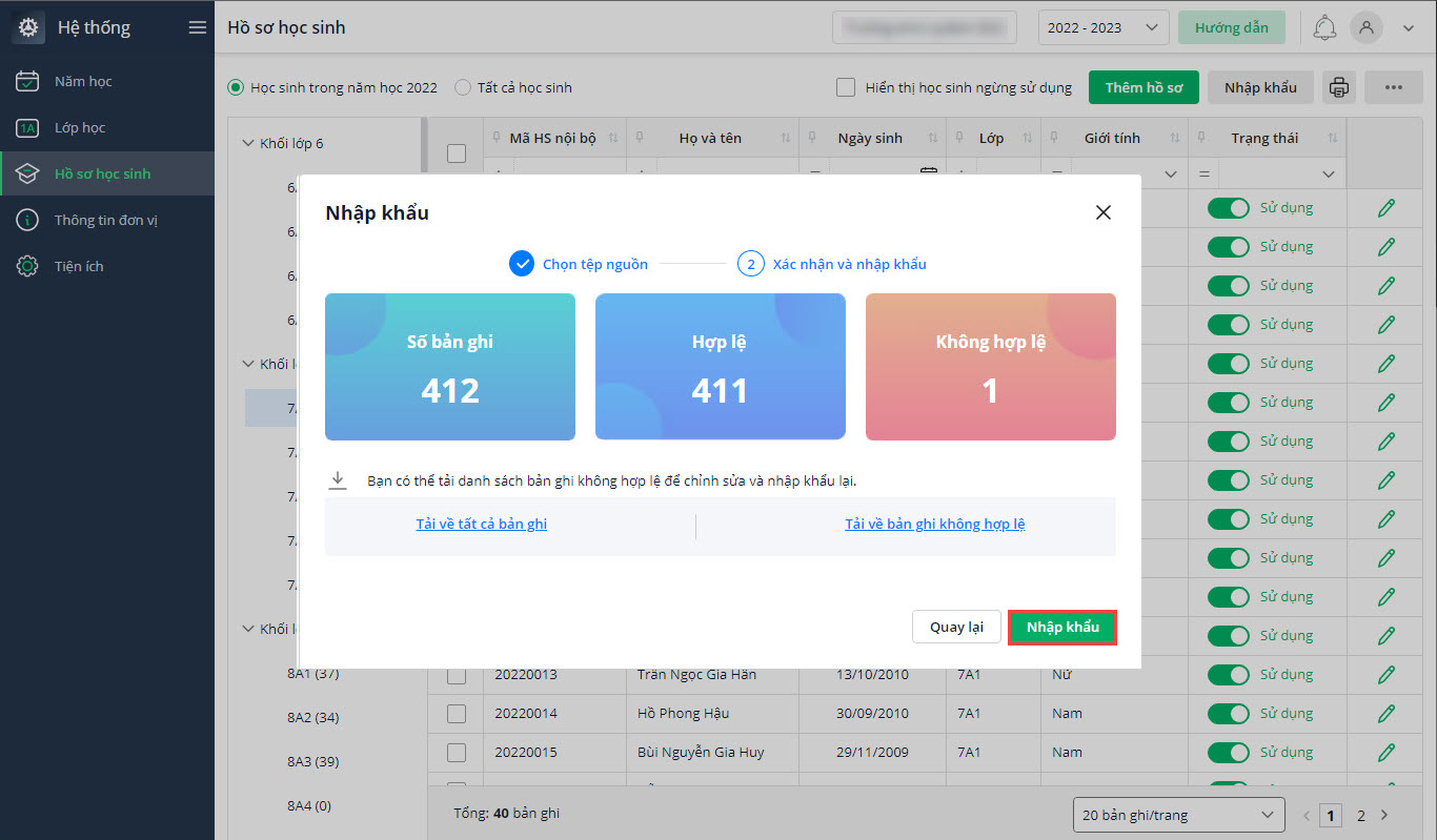 - Với bản ghi Hợp lệ: Anh/chị chọn Nhập khẩu để nhập khẩu thông tin vào phần mềm.