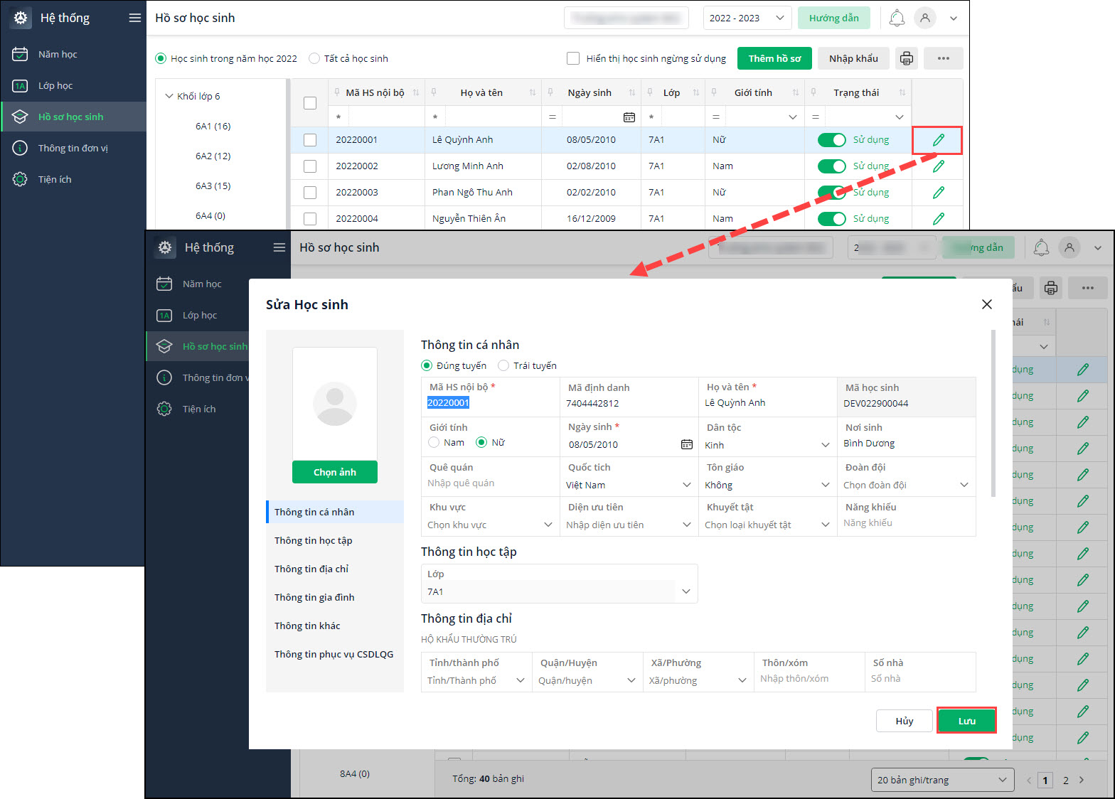 - Nếu muốn thay đổi thông tin trên hồ sơ học sinh, nhấn đúp chuột hoặc biểu tượng cây bút tại cuối dòng thông tin học sinh. Chỉnh sửa thông tin và nhấn Lưu để cập nhật thay đổi.
