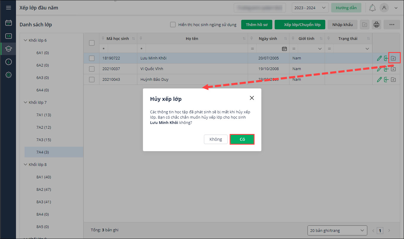 - Để hủy xếp lớp cho học sinh, anh/chị nhấn vào biểu tượng hủy xếp lớp tại cuối dòng thông tin học sinh tương ứng và xác nhận hủy: