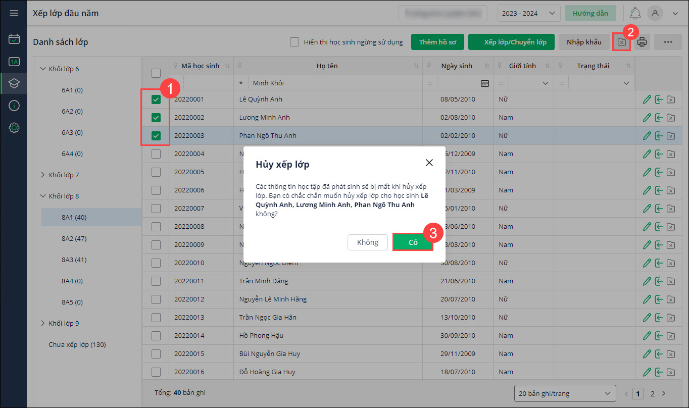 - Thao tác tương tự để hủy xếp lớp cho hàng loạt học sinh cùng lúc.