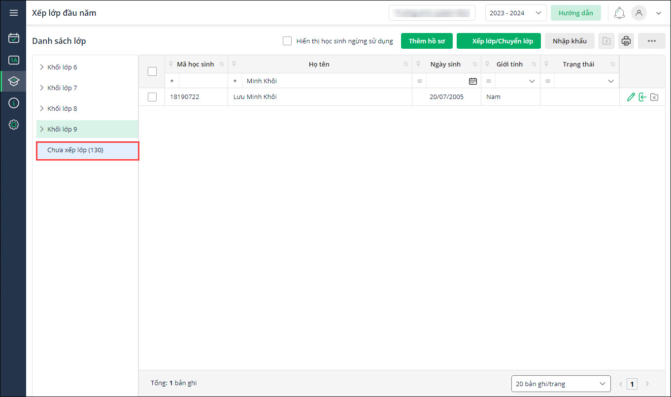 - Sau khi hủy xếp lớp thành công, hồ sơ học sinh được chuyển vào danh sách Chưa xếp lớp.