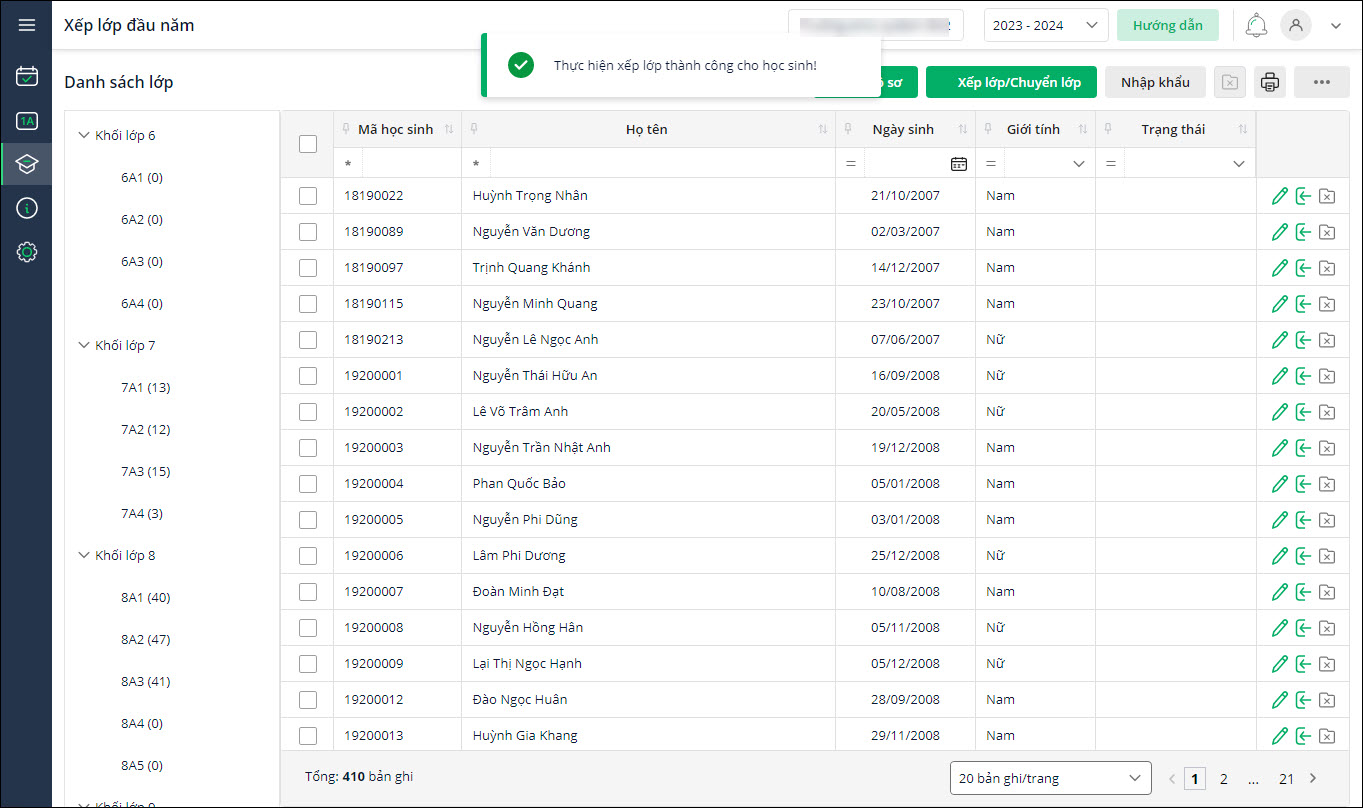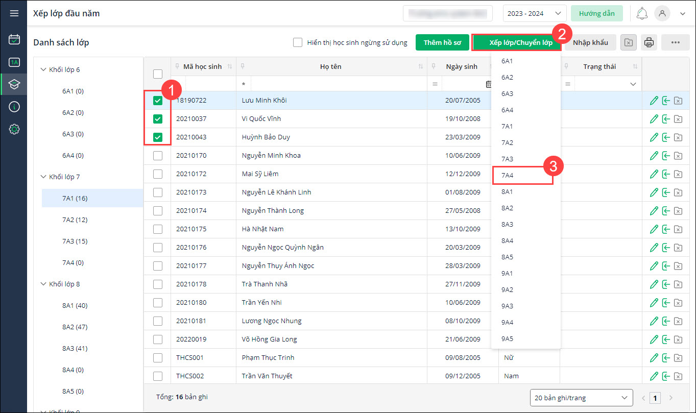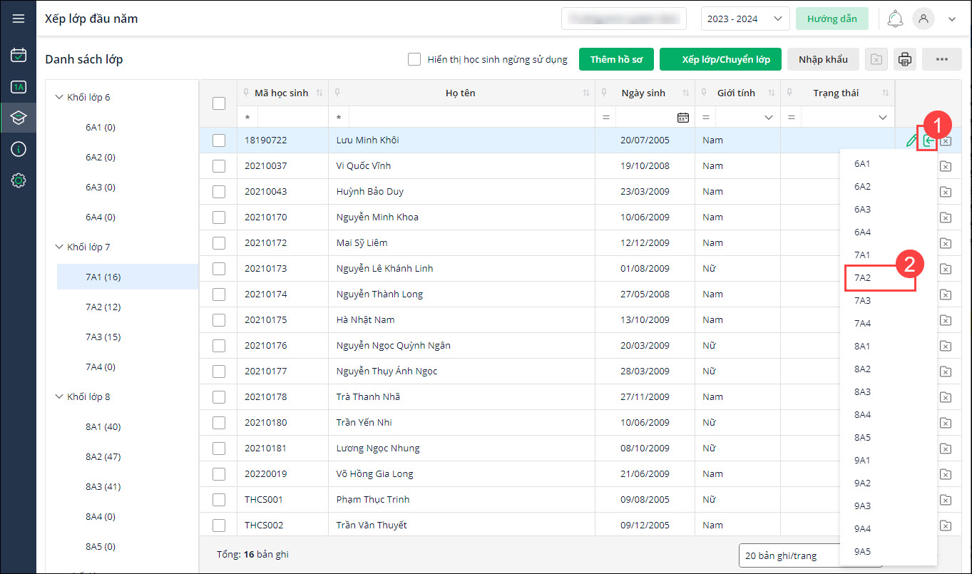 - Để xếp/chuyển lớp cho nhiều học sinh cùng lúc: Tích chọn các học sinh, nhấn vào Xếp lớp/Chuyển lớp và chọn lớp muốn chuyển đến.