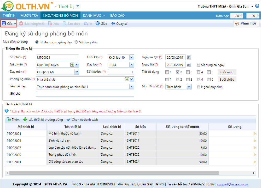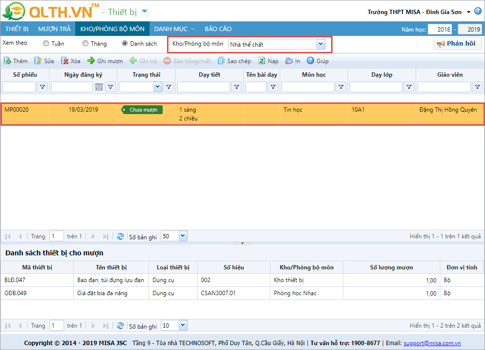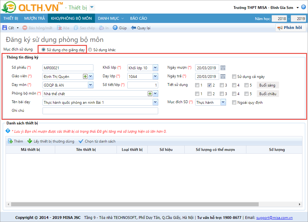 2. Trường hợp giáo viên lập luôn phiếu đăng ký mượn Kho/Phòng bộ môn, các thiết bị thuộc phòng học bộ môn đã đăng ký sẽ được cập nhật sang tình trạng Đang sử dụng trên các sổ sách liên quan.