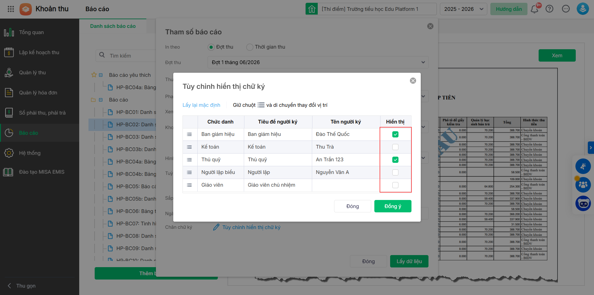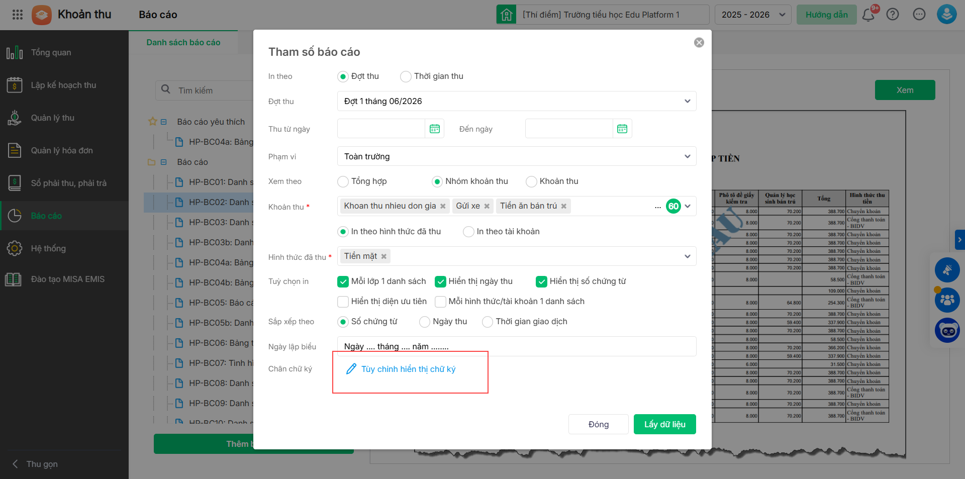 - Vào Khoản thu\Báo cáo, nhấp đúp chuột hoặc nhấn Xem vào báo cáo cần in. Chọn Tùy chỉnh hiển thị chữ ký.