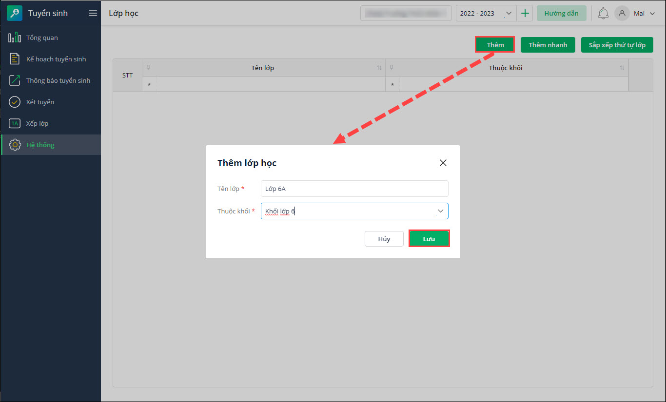 - Để thêm mới từng lớp, chọn Thêm lớp: Khai báo thông tin lớp vào ô tương ứng, nhấn Lưu để tạo lớp.