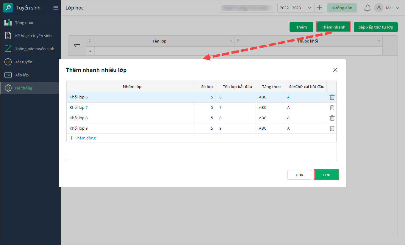- Để thêm mới hàng loạt lớp học theo quy tắc riêng, chọn Thêm nhanh: