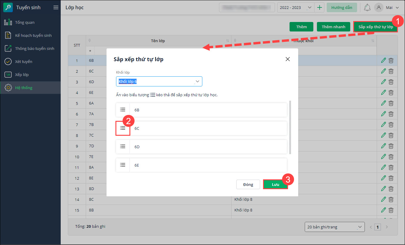 - Để thay đổi thứ tự các lớp trong báo cáo đầu ra, anh/chị có thể Sắp xếp thứ tự lớp học bằng cách nhấn vào biểu tượng bên dưới và kéo thả lớp đến vị trí mong muốn trong danh sách. Nhấn Lưu để cập nhật thứ tự.
