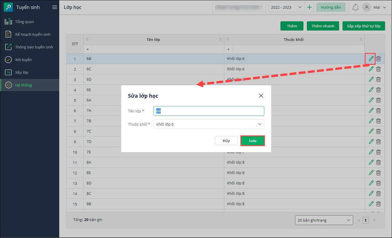- Trường hợp lớp có thay đổi thông tin, anh/chị nhấn đúp vào dòng thông tin lớp hoặc nhấn vào biểu tượng cây bút cuối dòng để chỉnh sửa lớp. Nhấn Lưu để cập nhật thông tin thay đổi.