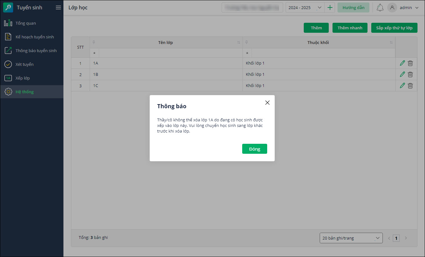 Lưu ý: Trường hợp đã xếp học sinh vào lớp, anh/chị không thể xóa lớp. Vui lòng chuyển hết học sinh sang lớp khác trước khi xóa lớp.