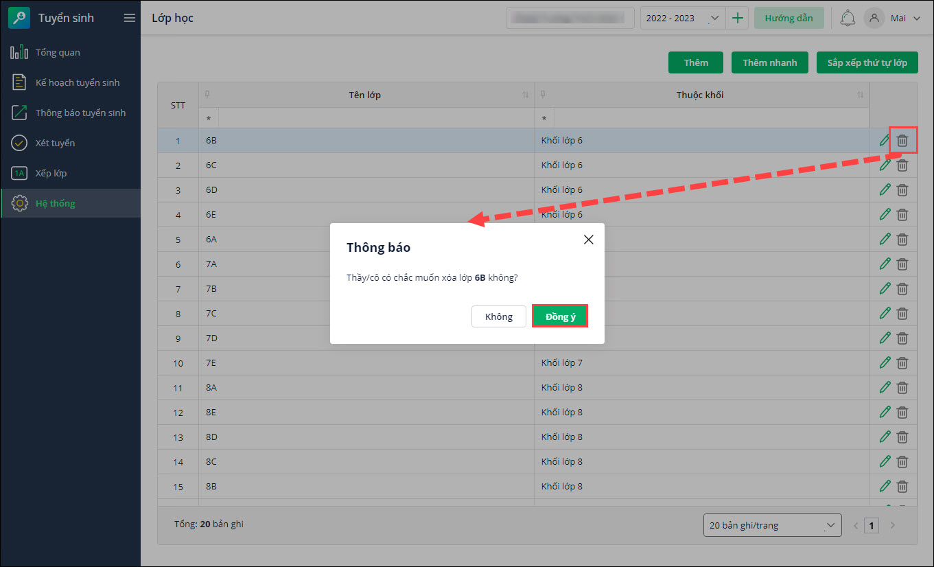- Để xóa lớp khỏi danh sách lớp học, nhấn vào biểu tượng thùng rác và xác nhận xóa.