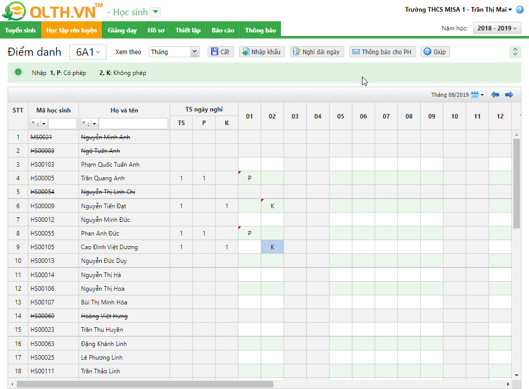 • Thực hiện điểm danh cho học sinh. Lưu ý: Có thể nhập nhanh với phím 1 là Nghỉ có phép và phím 2 là nghỉ không phép.