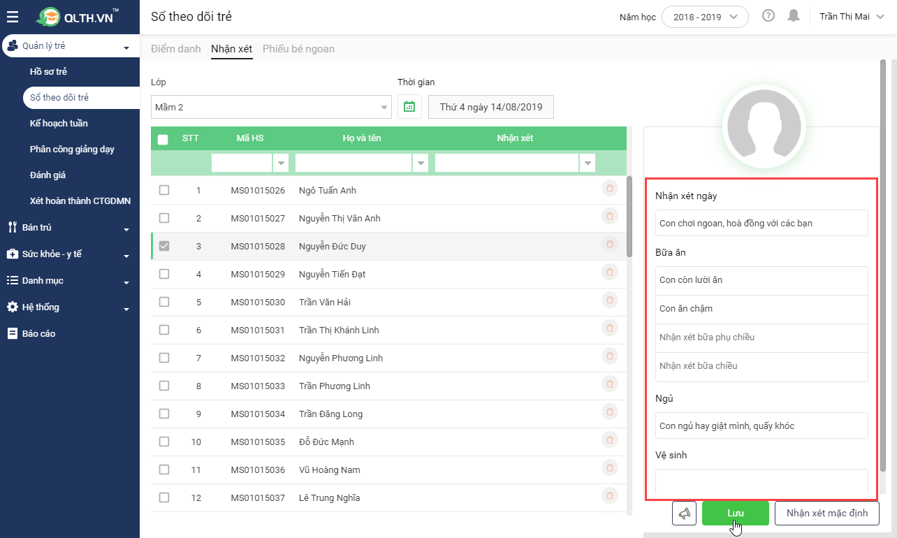 • Lựa chọn Lớp và thời gian cần nhận xét cho trẻ