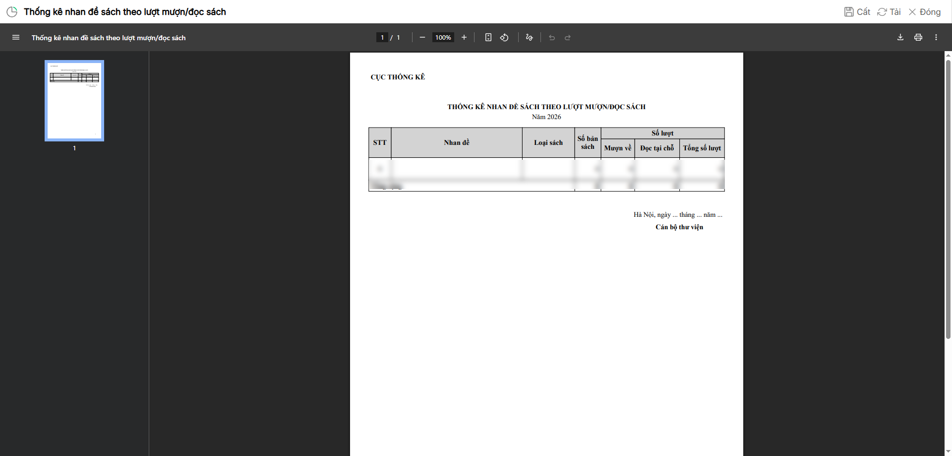 3. Chọn Đồng ý, phần mềm thống kê nhanh đề sách theo lượt mượn/đọc sách. Anh/chị có thể chọn Cất để tải file dưới nhiều định dạng (PDF, Excel, Word).